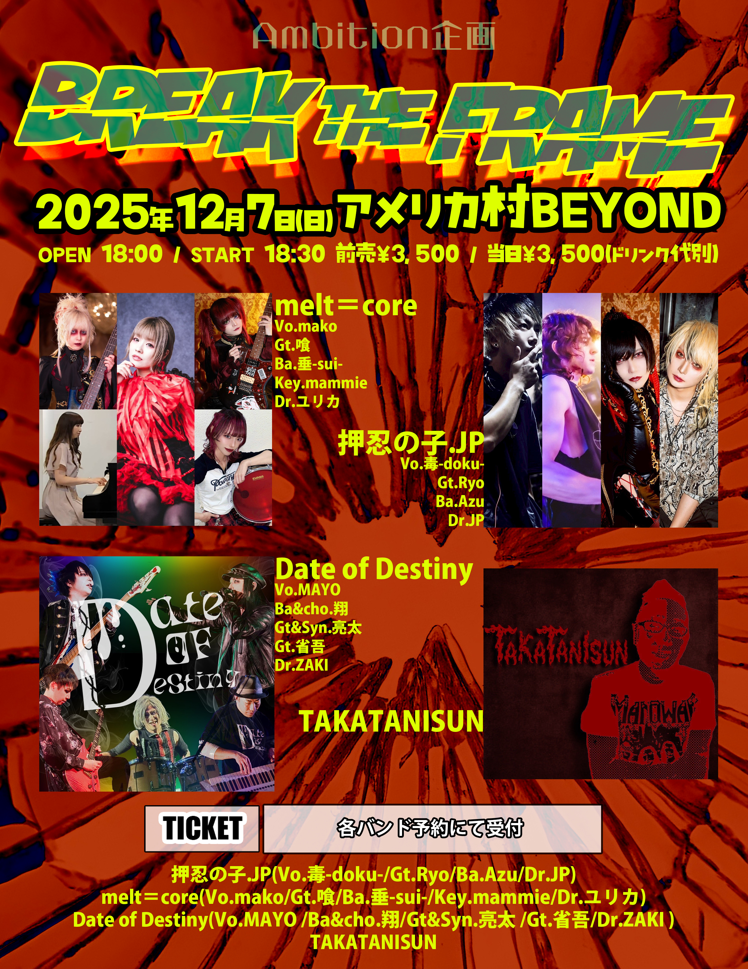 - 押忍の子.JP(Vo.毒-doku-/Gt.Ryo/Ba.Azu/Dr.JP) melt=core(Vo.mako/Gt.喰/Ba.垂-sui-/Key.mammie/Dr.ユリカ) Date of Destiny(Vo.MAYO /Ba&cho.翔/Gt&Syn.亮太 /Gt.省吾/Dr.ZAKI ) TAKATANISUN
