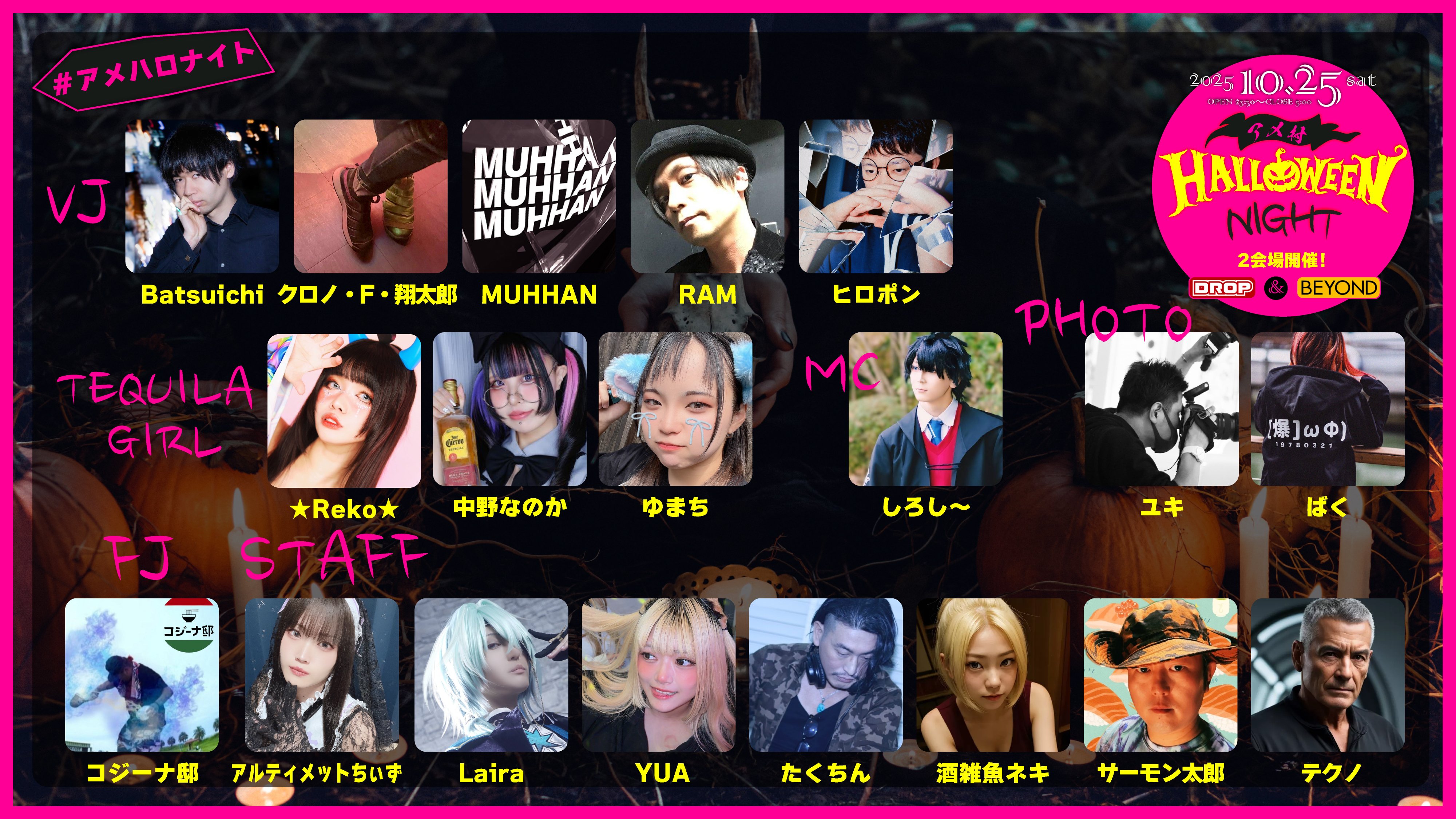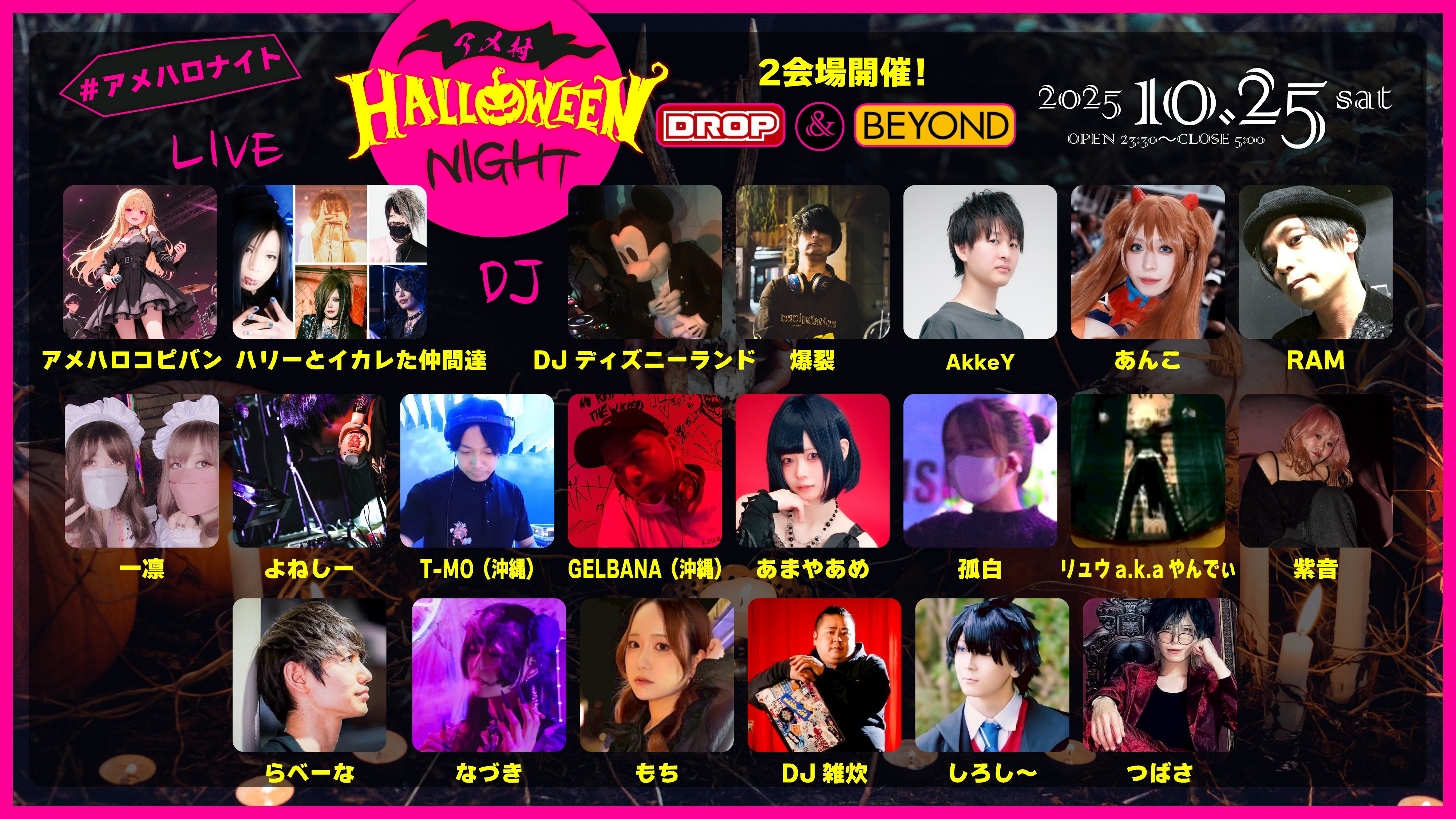 - <LIVE>アメハロコピバン<DJ>DJディズニーランド / 爆裂(CRXSH/時の扉) / あんこ(さぶステ/ゲーマーズヘブン) / RAM(ヲタ霊/異臭騒ぎ) / AkkeY(KAGIROI / USAGI Production) / 紫音(J-ROCK大作戦/LABAR) / らべーな(イケナイ / YAAAAAS) / 一凛(BunGeee⭐️/ヲタ霊) / よねしー(ひみつきち!/untitled) / 孤白(ヲタ霊/くろすおーば〜) / T-MO(沖縄) / GELBAN(沖縄)(ANIMELT/OPED) / あまやあめ / リュウa.k.aやんでぃ(EVILCIRCUS/漆黒の音楽会) / なづき(さぶクル) / もち(Kyun) / DJ雑炊(HOTLIP/M@STER RAMPAGE) / つばさ(Freja/XOXODAY) / しろし〜(花見ンヌ)<VJ> / Batsuichi(Bungeee☆/ラビフロ!!) / クロノ・F・翔太郎(技☆術☆部) / ヒロポン(YAAAAAS!!!!!/キュアカニ) / MUHHAN <TEQUILA GIRL>★Reko★ / 中野なのか / ゆまち <PHOTO>ばく / ユキ <STAFF>FJコジーナ(コジーナ邸) / アルティメットちぃず / Laira(ほし☆グリ/まいスタ) / YUA(ボカロナイト/みんめしF) / 酒雑魚ネキ / たくちん / テクノ / サーモン太郎(BunGeee⭐️)