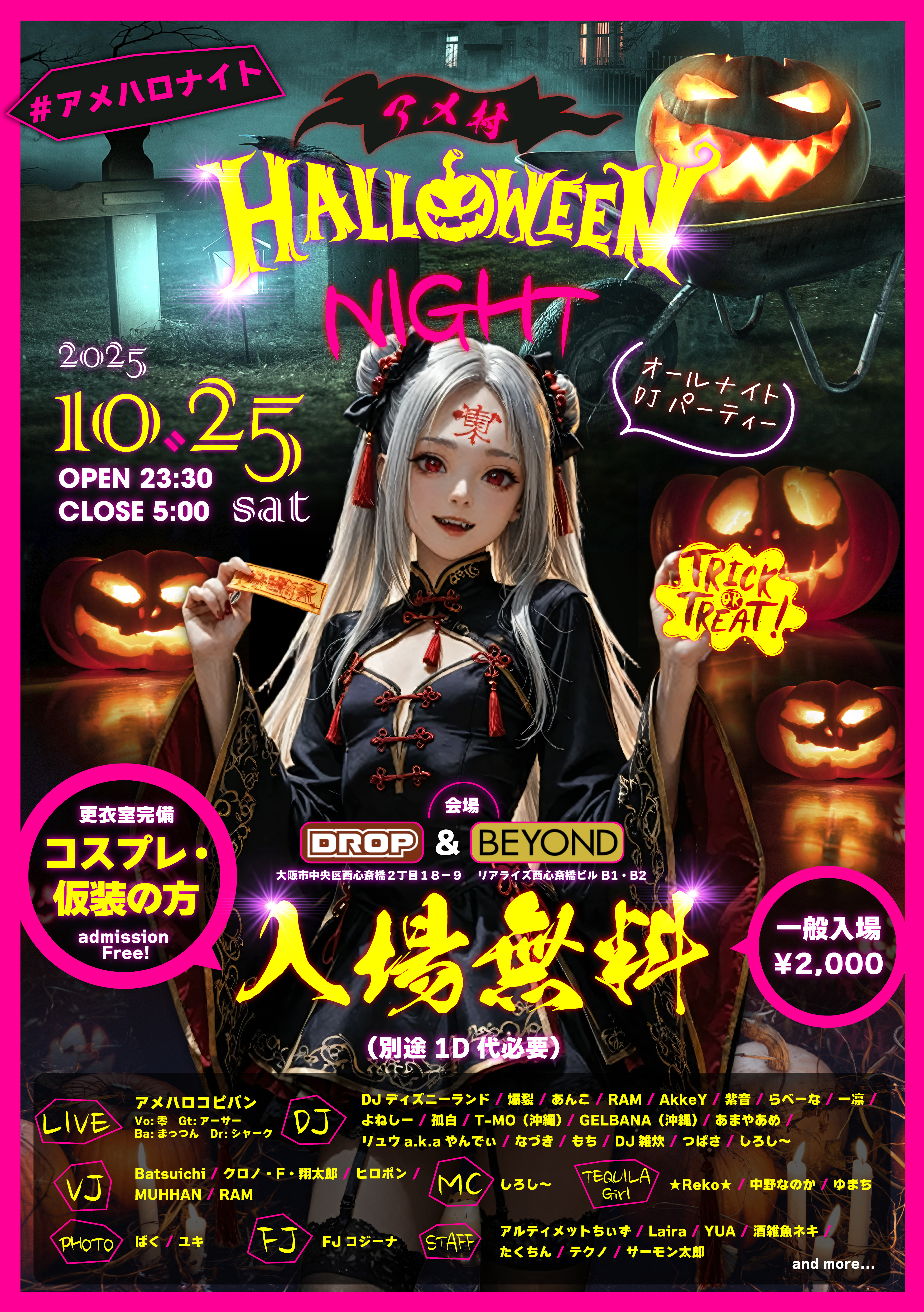 - 仮装&コスプレ 無料 / 一般 ¥2,000(各種、別途1Drink代金¥700-必要) ※入場時にIDチェックを行いますので、身分証の提示をお願いいたします。