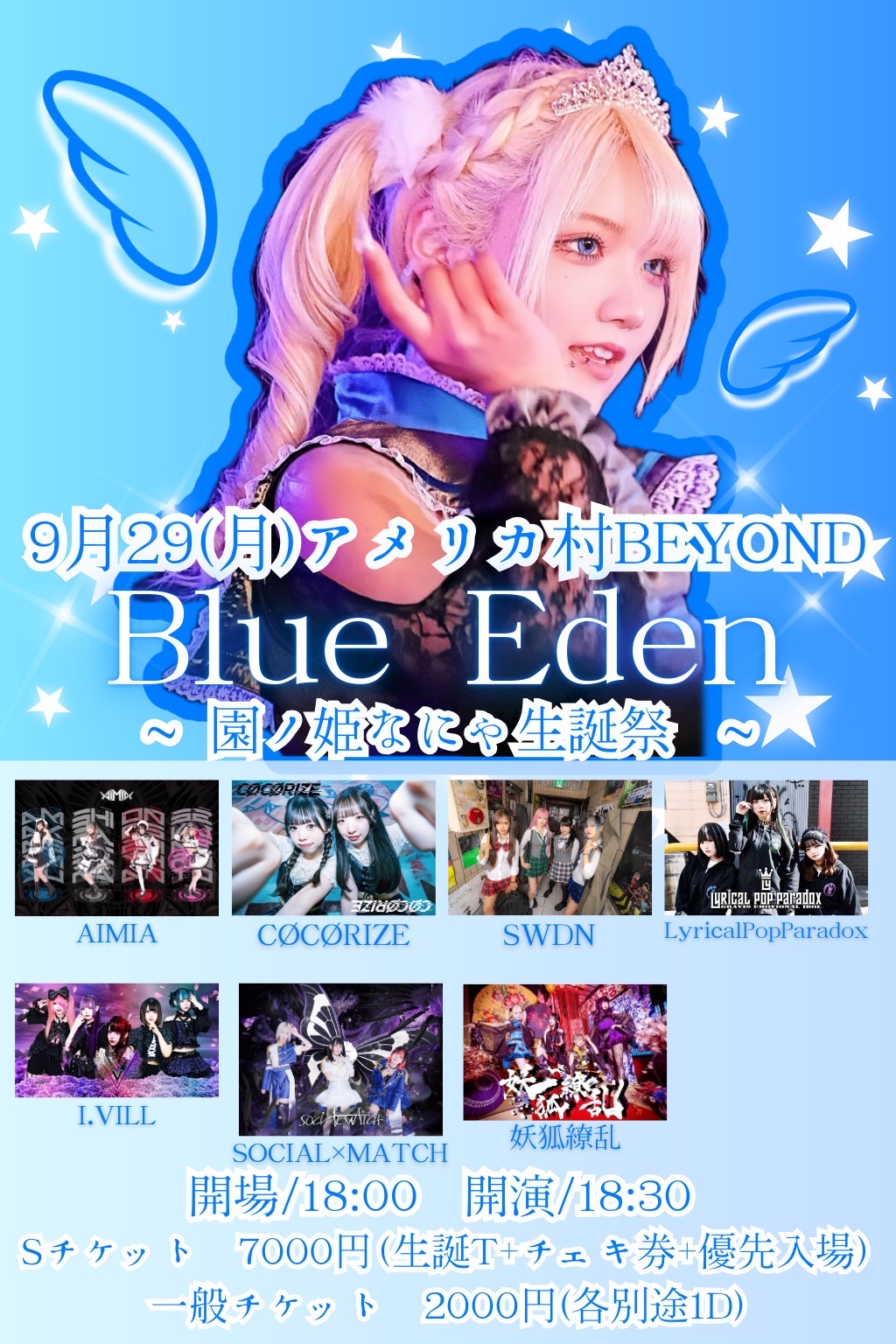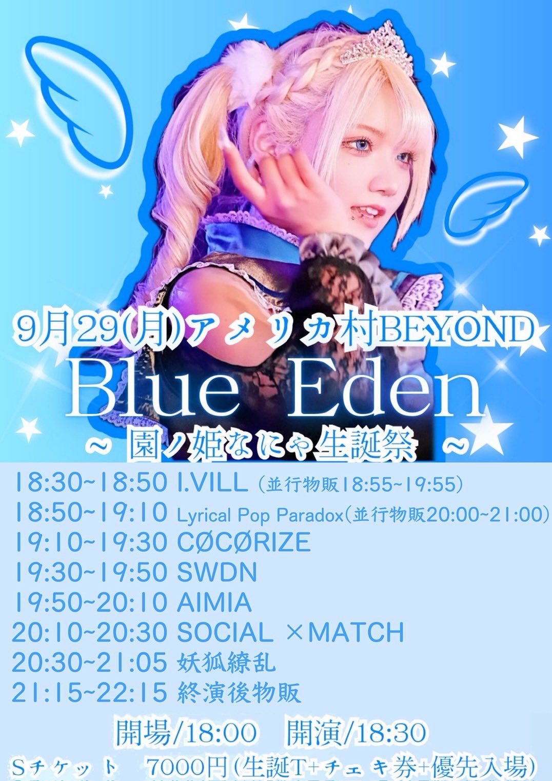 アメリカ村 BEYOND スケジュール 2025.9.29(Mon) Blue Eden〜園ノ姫なにゃ生誕祭〜 [ACT] 妖狐繚乱 / AIMIA / CØCØRIZE / lyricalpopparadox / I.VILL / SOCIAL×MATCH / SWDN [OPEN/START] 18:00/18:30 [料金] Sチケット7,000円 / 一般2,000円(別途1Drink代金¥700-必要) TIGET:https://tiget.net/events/427368 (問)uniプロダクション