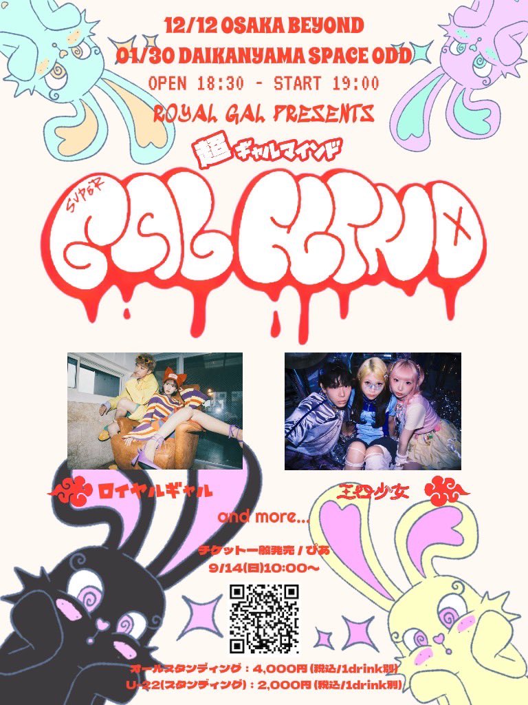 アメリカ村 BEYOND スケジュール 2025.12.12(Fri) ロイヤルギャルPresents "超ギャルマインド" [ACT] ロイヤルギャル / 三四少女 / and more... [OPEN/START] 18:30/19:00 [料金] ADV/U-22/DOOR ¥4,000/¥2,000/¥TBA(別途1Drink代金¥700-必要) チケット先行販売(ぴあ) 8/9(土)21:00〜〈先着順〉 https://w.pia.jp/t/supergalmind/ 主催:ロイヤルギャル お問い合わせ:キョードー関西