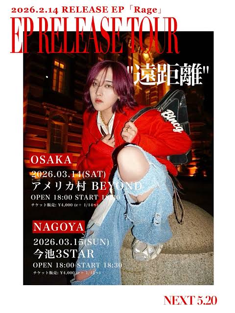 アメリカ村 BEYOND スケジュール 2026.3.14(Sat) 1st EP「Rage」リリースツアー「遠距離」 [ACT] 香月 紅茶 [OPEN/START] 18:00/18:30 [料金] ADV/DOOR ¥4,000/¥--(別途1Drink代金¥700-必要) (問)アメリカ村 BEYOND 06-6214-2900