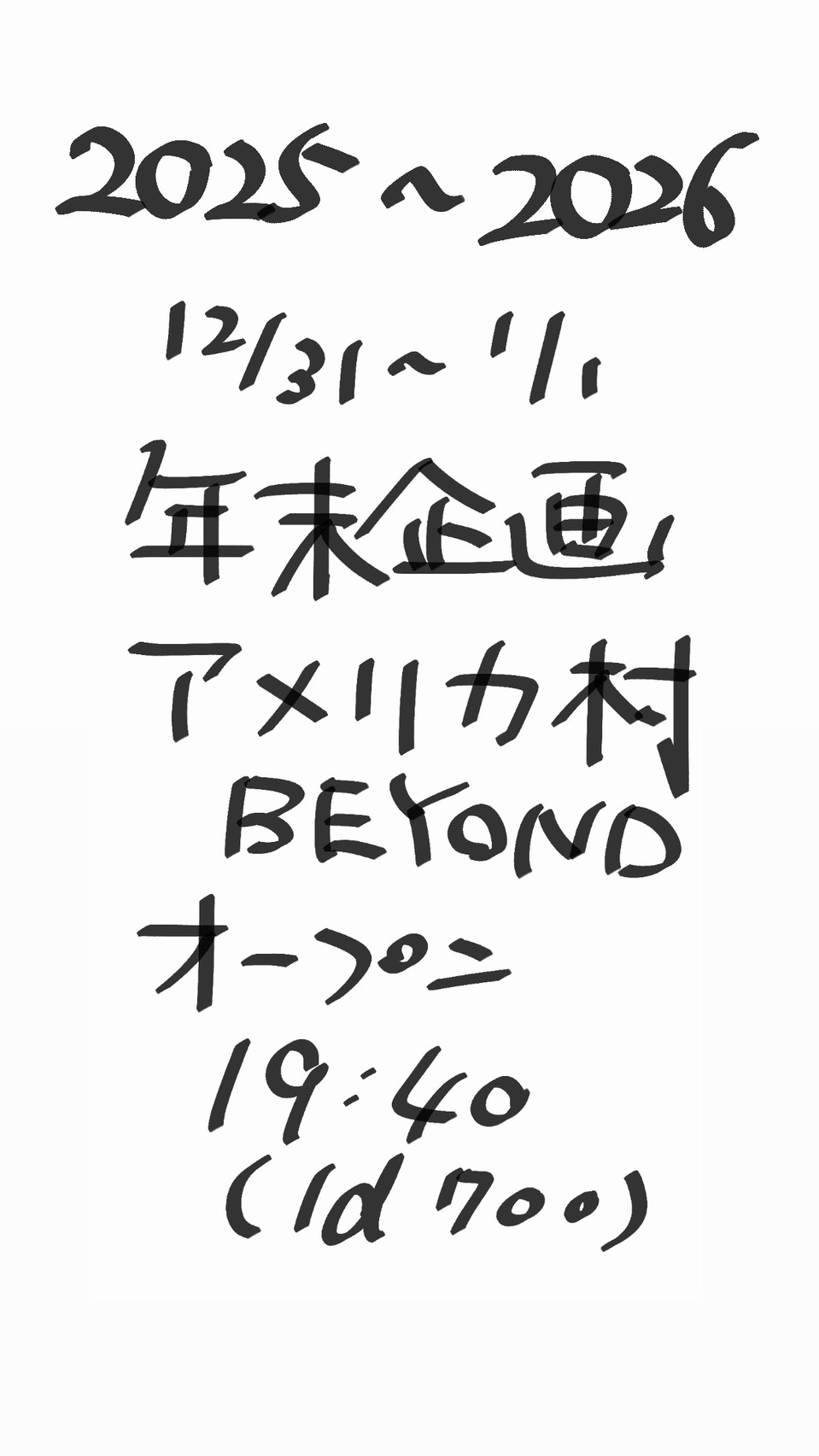 アメリカ村 BEYOND スケジュール 2025.12.31(Wed) 年末企画 [ACT] mumei. / ティンダーズハイ / ぐるぐるえろ狩りワンダーランド / 年越しFEVER / SwallowSense / デンマの宝刀 / ふるかわちるどれん / ざ・びろーんず / 年越しスキャンダル / 君と羊とあけおめ / あゆ、ぴかちゃんになる! / ハードゲイフォーlimited Sazabys / RE:はぴはぴ相談カウンター / B'low [OPEN/START] 19:40/19:50 [料金] FREE(別途1Drink代金¥700-必要) (問)アメリカ村 BEYOND 06-6214-2900