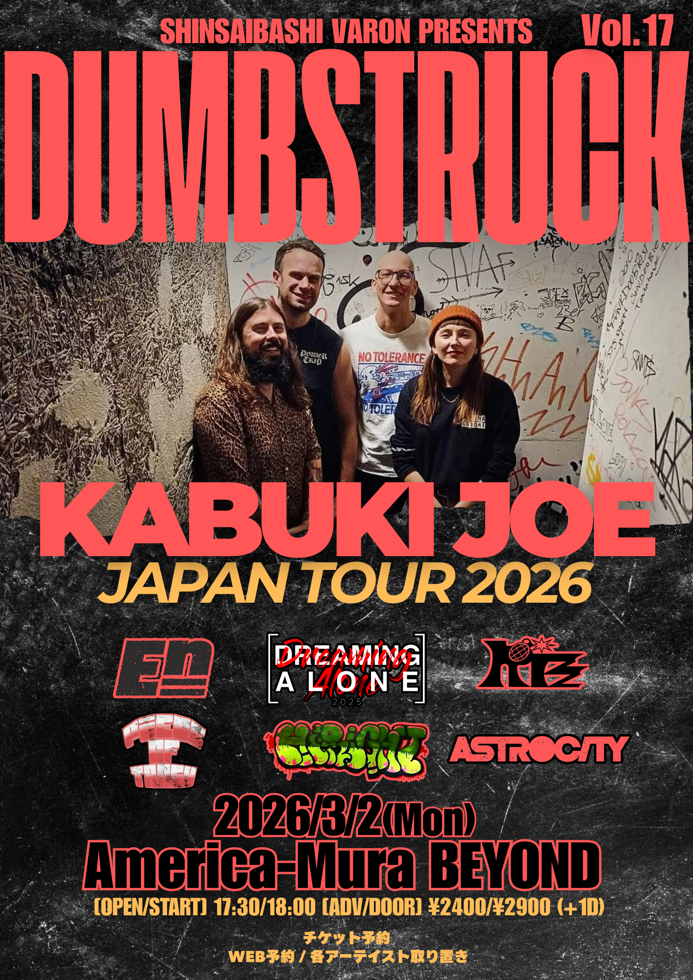 アメリカ村 BEYOND スケジュール 2026.3.02(Mon) Dumbstruck Vol.16 KABUKI JOE JAPAN TOUR [ACT] KABUKI JOE(スイス) / ASTROCITY / PIECE OF TRASH / DREAMING ALONE / En / hi-right / Rizz [OPEN/START] 17:30 / 18:00 [料金] ¥2400/¥2900 (+1D) (問)アメリカ村 BEYOND 06-6214-2900