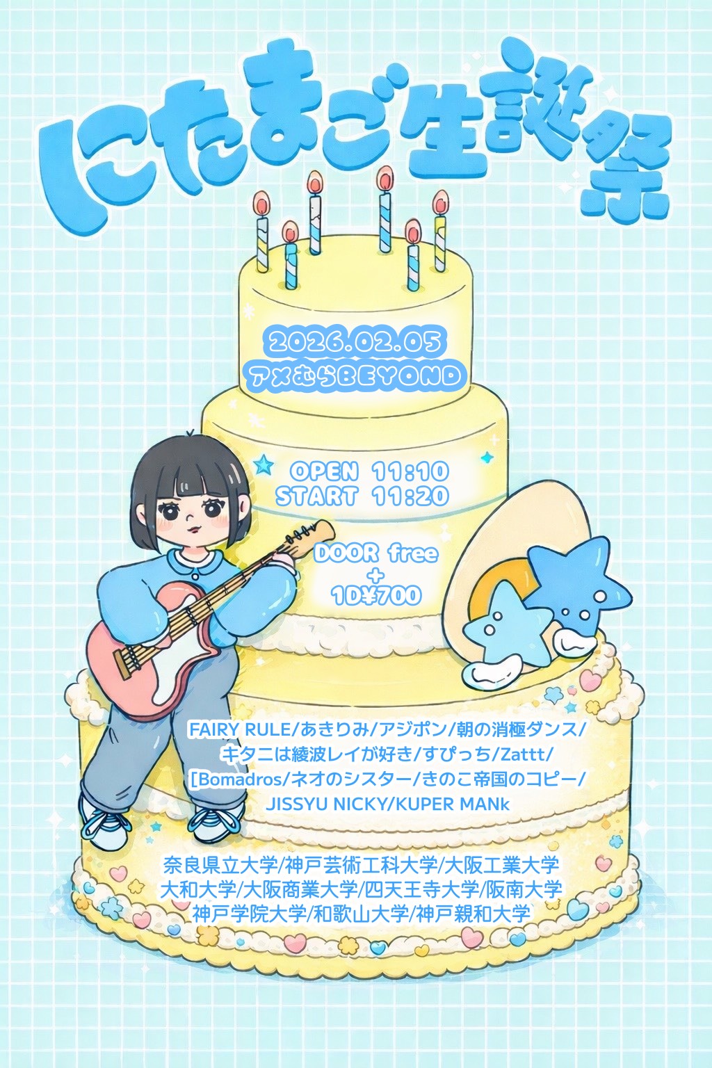 アメリカ村 BEYOND スケジュール 2026.2.05(Thu) ゆな企画 [ACT] FAIRY RULE / あきりみ / アジポン / 朝の消極ダンス / キタニは綾波レイが好き / すぴっち / Zattt / [Bomadros] / ネオのシスター / きのこ帝国のコピー / JISSYU NICKY / KUPER MANk [OPEN/START] 11:10/11:20 [料金] DOOR FREE(別途1Drink代金¥700-必要) (問)アメリカ村 BEYOND 06-6214-2900