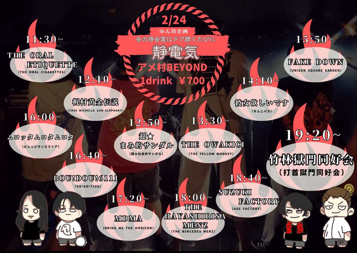アメリカ村 BEYOND スケジュール 2026.2.24(Tue) ゆんぼう企画 [ACT] THE ORAL ETIQUETTE / 梶村黄金伝説 / 超⭐まみ的サンダル / THE OWAKICI / 彼女欲しいです / fake down / ムコッタムコタ / BOU!DOU!6111 / MDMA / the hayashirisa menz / Suzuki factory / 竹林獄門同好会 [OPEN/START] 11:20/11:30 [料金] FREE(別途1Drink代金¥700-必要) (問)アメリカ村 BEYOND 06-6214-2900