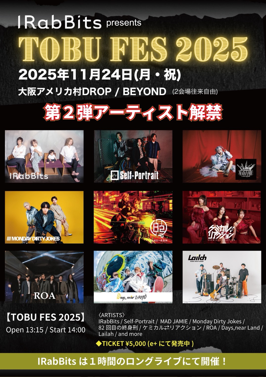 アメリカ村 BEYOND スケジュール 2025.11.24(Mon) TOBU FES 2025 [ACT] IRabBits / Self-Portrait / MAD JAMIE / Monday Dirty Jokes / 82回目の終身刑 / ケミカル⇄リアクション / ROA / Lailah / Days,near LAND / and more [OPEN/START] 13:15/14:00 [料金] ADV/DOOR ¥5,000/¥--(別途1Drink代金¥700-必要) (問)アメリカ村 BEYOND 06-6214-2900