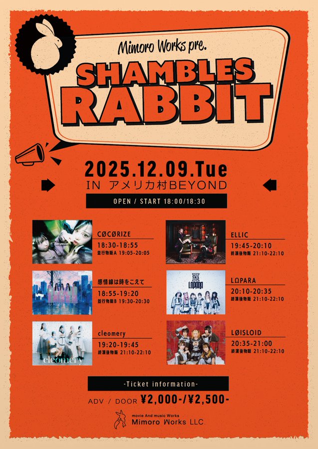 アメリカ村 BEYOND スケジュール 2025.12.09(Tue) Mimoro Works pre 『Shambles Rabbit』 [ACT] LΩPARA / cleomery / 感情線は時をこえて / CØCØRIZE / ELLIC / LØISLOID [OPEN/START] 18:00/18:30 [料金] ADV/DOOR ¥2000/¥2500(別途1Drink代金¥700-必要) (問)アメリカ村 BEYOND 06-6214-2900 【チケット】▼ https://livepocket.jp/e/rabbit_1209 ※2025年11月18日 22:00 発売開始