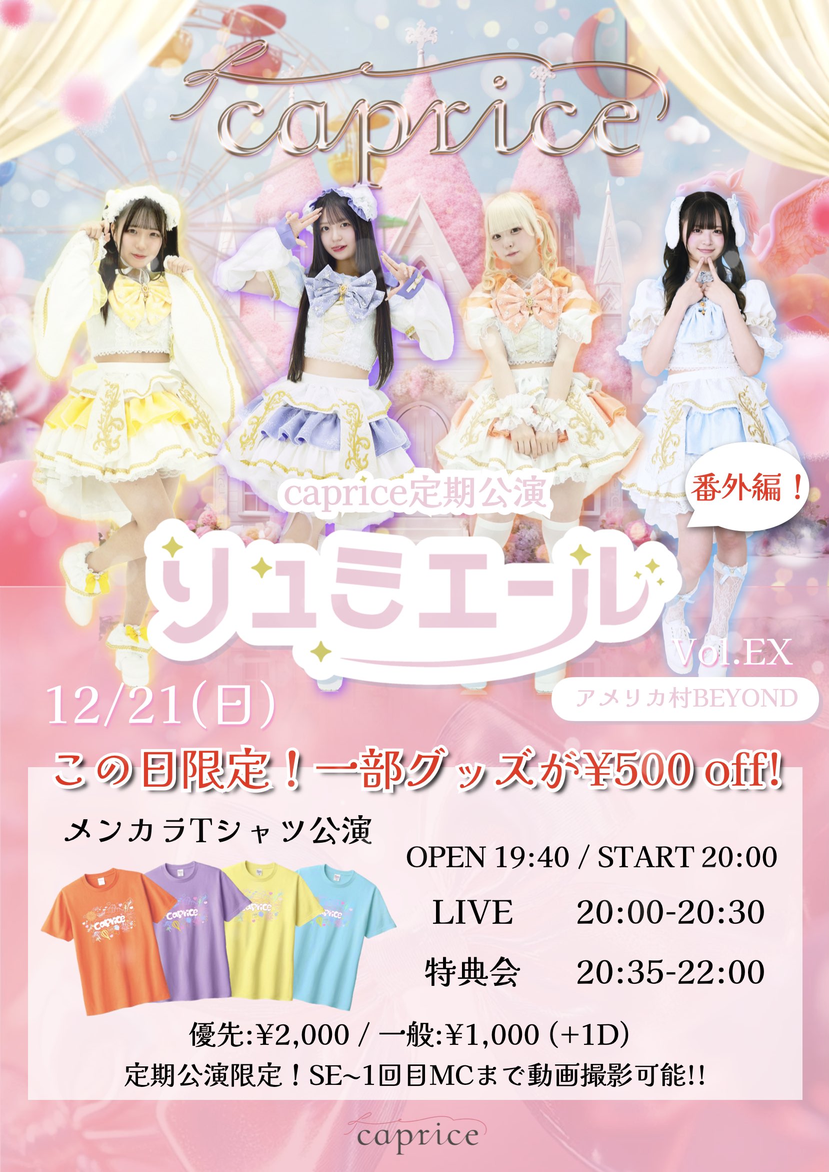 アメリカ村 BEYOND スケジュール 2025.12.21(Sun) caprice定期公演番外編! リュミエールVol.EX「メンカラTシャツ公演」 [ACT] caprice [OPEN/START] 19:40/20:00 [料金] 優先入場¥2,000 /一般 ¥1,000(別途1Drink代金¥700-必要) https://t-dv.com/caprice1221 12/9(火) 20:00~受付開始! (問)アメリカ村 BEYOND 06-6214-2900