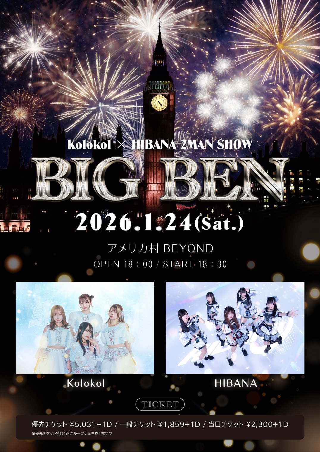 アメリカ村 BEYOND スケジュール 2026.1.24(Sat) Kolokol × HIBANA 2MAN SHOW 『BIG BEN』 [ACT] Kolokol / HIBANA [OPEN/START] 18:00/18:30 [料金] 優先 ¥5,031 / 一般 ¥1,859 / 当日 ¥2,300(別途1Drink代金¥700-必要) 優先:各グループのチェキ券1枚付き 12/30(火)21:00販売開始 https://t-dv.com/BIGBEN (問)株式会社PLAYPIT(info@playpit.jp)
