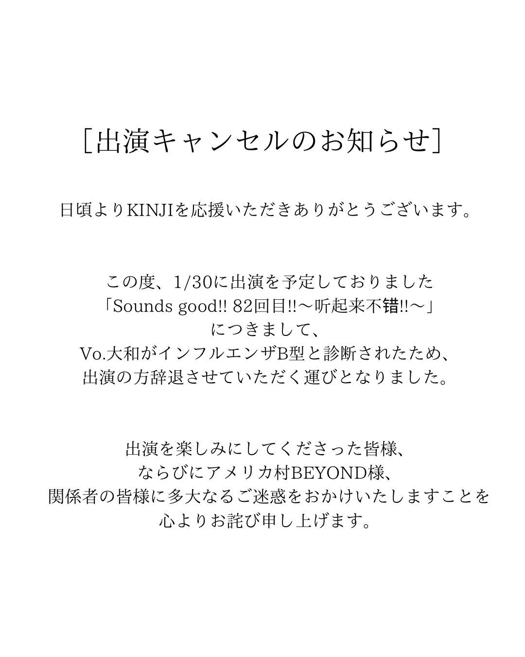 ※出演予定だったKINJIですが、Vo.大和がインフルエンザB型と診断されたため、出演キャンセルとなりました。