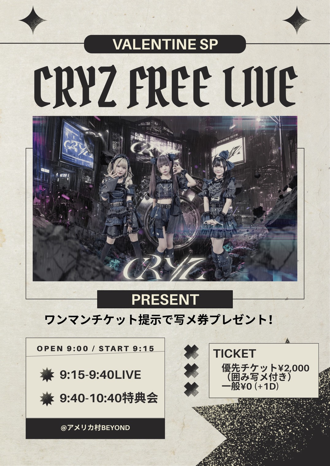 アメリカ村 BEYOND スケジュール 2026.2.14(Sat) 『CRYZ単独公演 -バレンタインSP-』 [ACT] CRYZ [OPEN/START] 9:00/9:15 [料金] 優先チケット¥2,000(囲み写メ付き) /一般チケット¥0(別途1Drink代金¥700-必要) 【チケット発売】 2月13日(金)20:00発売開始 ? https://t-dv.com/cryz_valentine_sp (問)アメリカ村 BEYOND 06-6214-2900