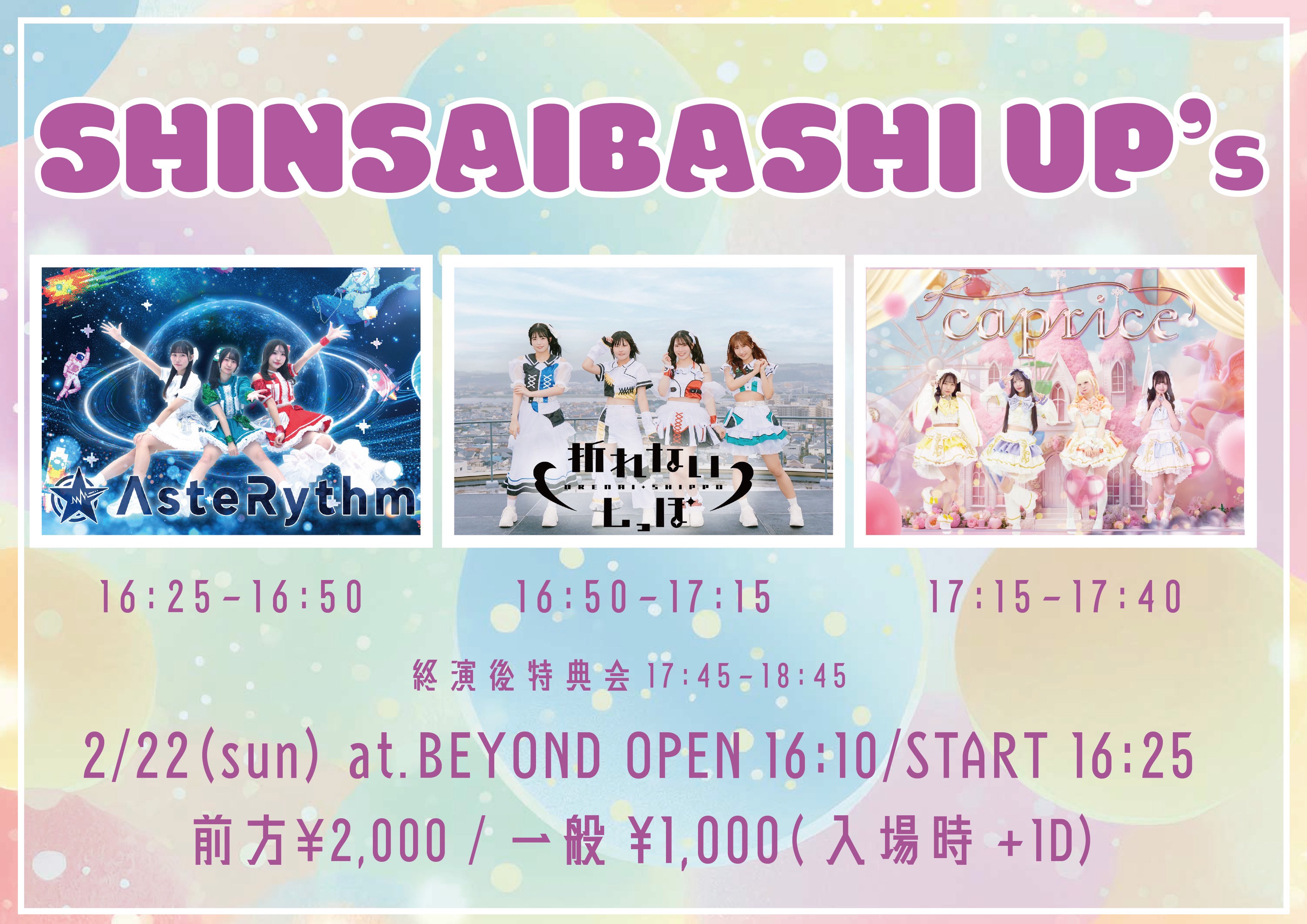 アメリカ村 BEYOND スケジュール 2026.2.22(Sun) SHINSAIBASHI UP's [ACT] AsteRythm / 折れないしっぽ / caprice [OPEN/START] 16:10/16:25 [料金] 前方2,000円 / 通常1,000円 当日+500円(別途1Drink代金¥700-必要) [チケットURL] https://ticketdive.com/event/SU0222 (問)SHINSAIBASHI UP's(info.qube.event@gmail.com)