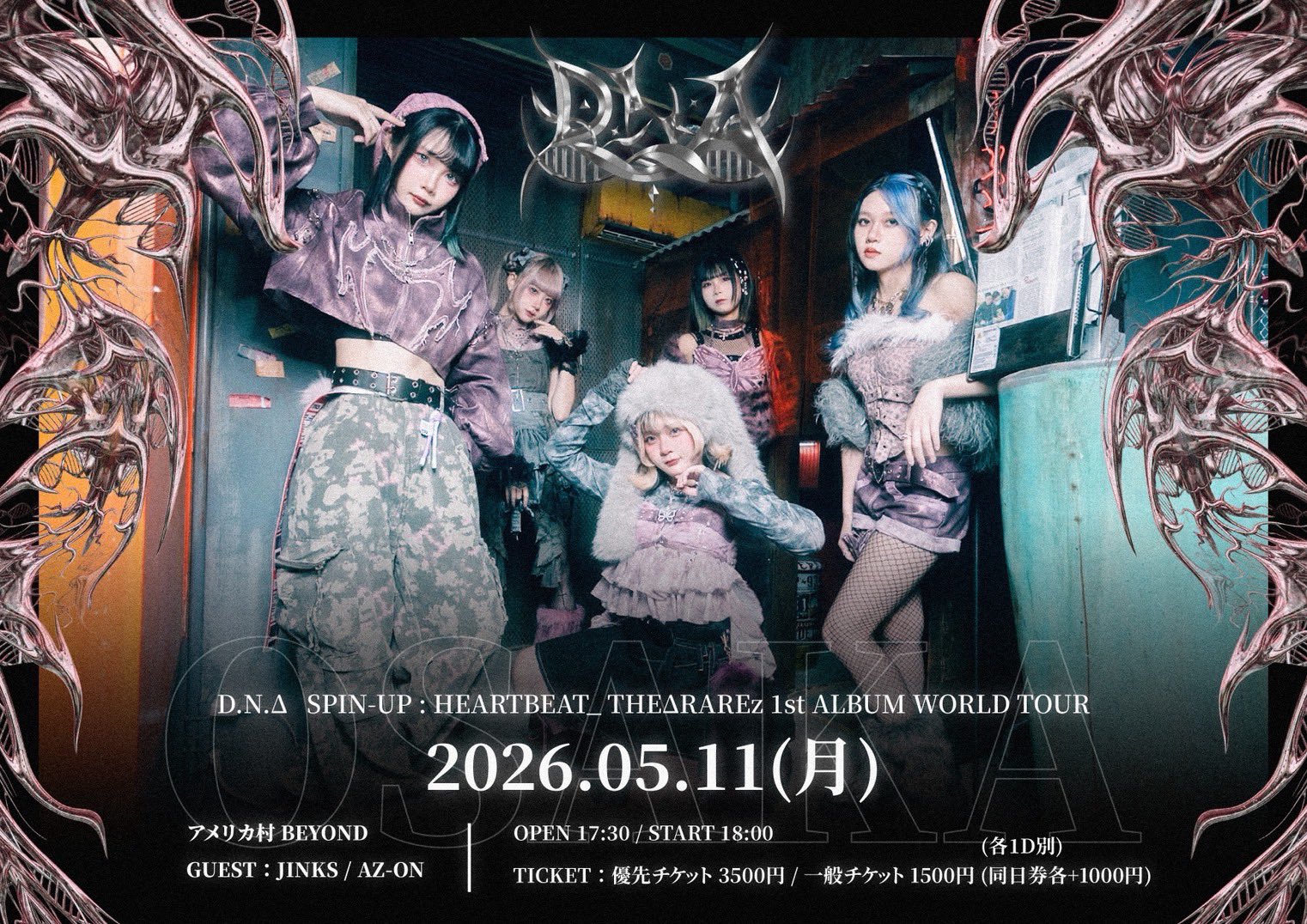 アメリカ村 BEYOND スケジュール 2026.5.11(Mon) 《D.N.Δ》SPIN-UP:HEARTBEAT_THEΔRAREz 1st ALBUM WORLD TOUR [ACT] THEΔRAREz / JINKS / AZ-ON [OPEN/START] 17:30/18:00 [料金] 優先チケット¥3500 / 一般チケット¥1500 (別途1Drink代金¥700-必要) (問)アメリカ村 BEYOND 06-6214-2900 チケット →tiget.net/events/482717