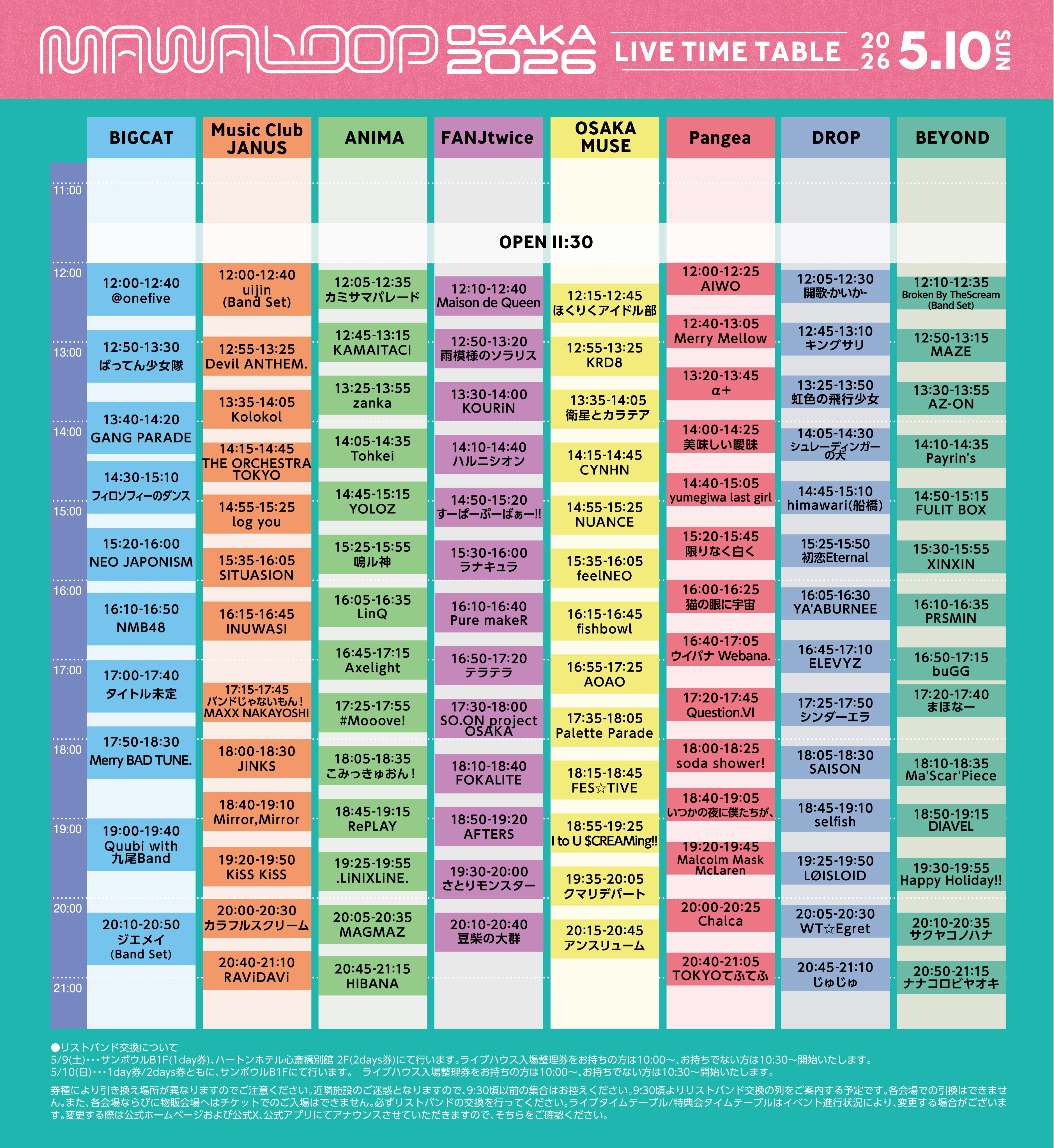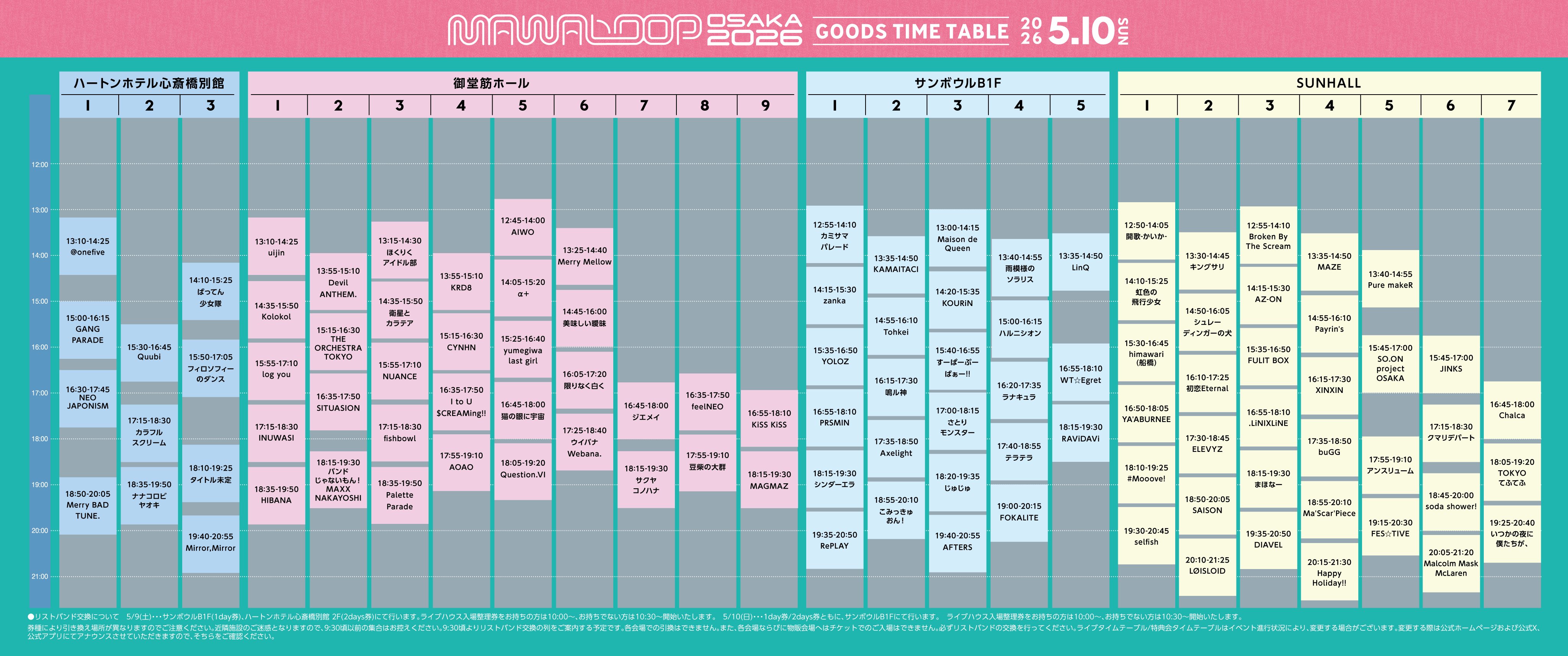 - リストバンド交換 10:00 / 開場 11:30 / 開演 12:00 ※会場により開場/開演時間が異なります。