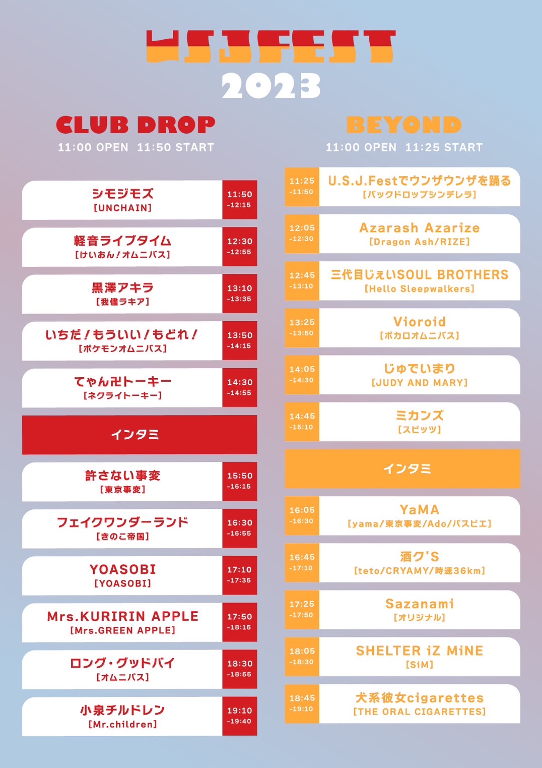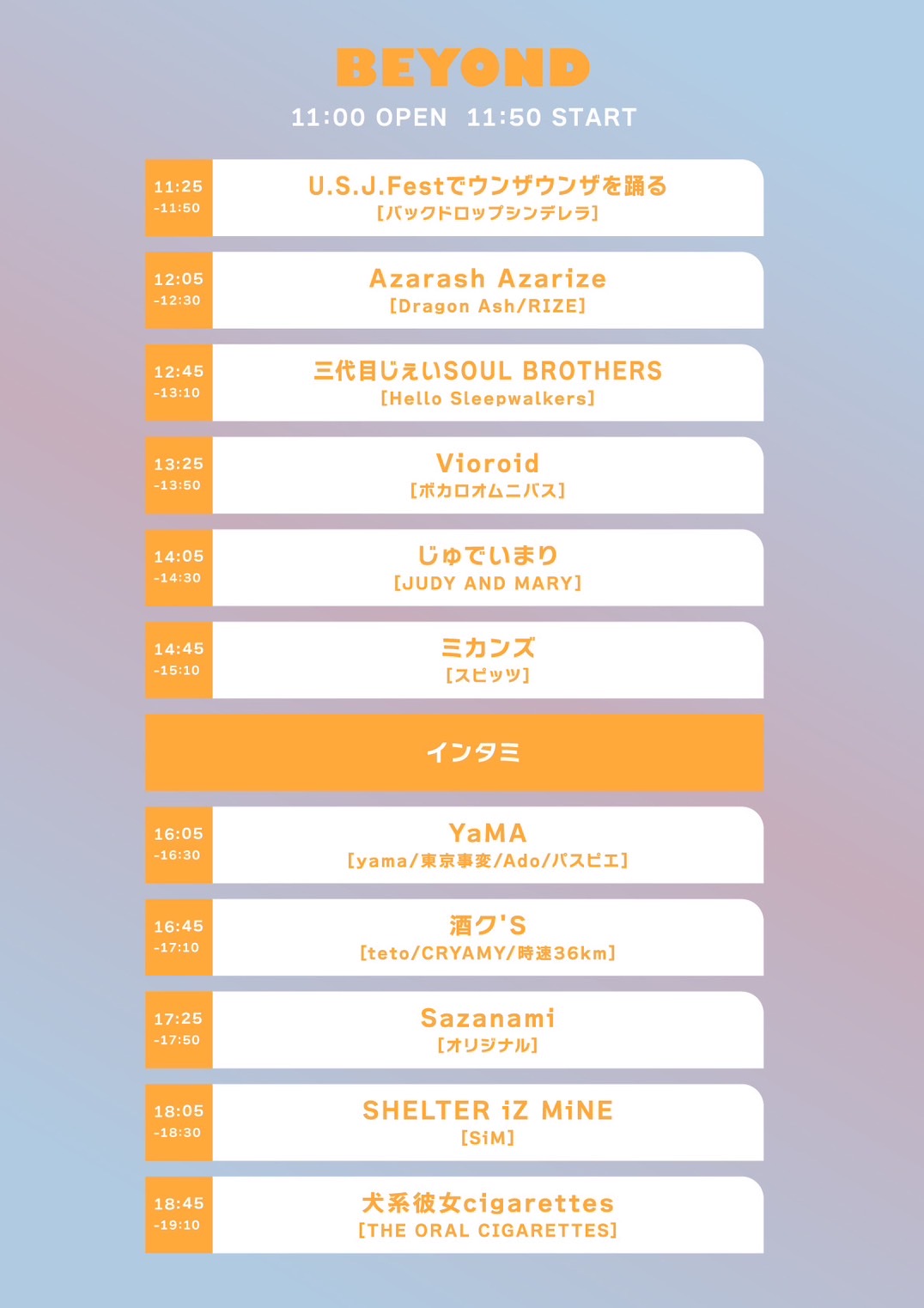 アメリカ村 BEYOND スケジュール 2023.11.03(Fri) U.S.J Fest. 2023 [ACT] U.S.J.Festでウンザウンザを踊る / Azarash Azarie / Vioroid / 三代目じぇいSOUL BROTHERS / じゅでいまり / ミカンズ / YaMA / 酒ク'S / Sazanami / SHELTER iZ MiNE / 犬系彼女cigarettes [OPEN/START] 11:00/11:25 [料金] DOOR ¥1,000+1drink ¥600 (問)アメリカ村 BEYOND 06-6214-2900