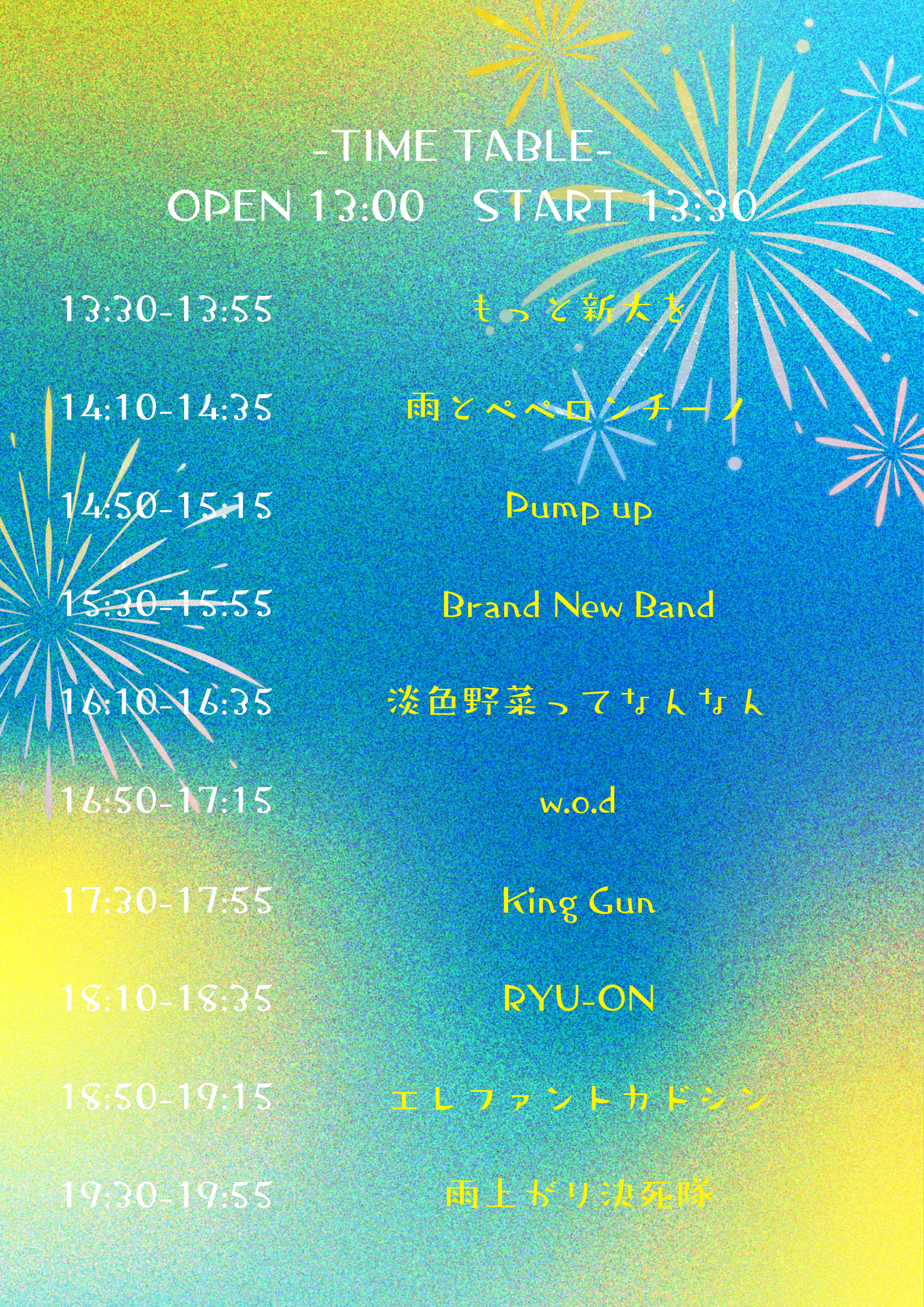アメリカ村 BEYOND スケジュール 2023.8.31(Thu) にがや×響pre. 「夏休み!!まだ終わらんとって~!!」 [ACT] もっと新大を / 雨とペペロンチーノ / Pump up / Brand New Band / 淡色野菜ってなんなん / w.o.d / King Gun / RYU-ON / エレファントカドシン / 雨上がり決死隊 [OPEN/START] 13:00/13:30 [料金] TICKET FREE(別途1Drink代金¥600-必要) (問)アメリカ村 BEYOND 06-6214-2900