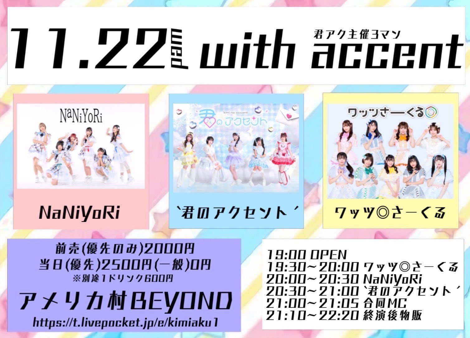 アメリカ村 BEYOND スケジュール 2023.11.22(Wed) with accent Vol.2 [ACT] '君のアクセント' / ワッツ◎さーくる / NaNiYoRi [OPEN/START] 19:00/19:30 [料金] 前売り(優先のみ) ¥2,000/当日(優先) ¥2,500/当日(一般) ¥0(別途1Drink代金¥600-必要) ▷チケット購入 http://tiget.net/events/282008 【11/10(金)20:00発売】 (問)アメリカ村 BEYOND 06-6214-2900