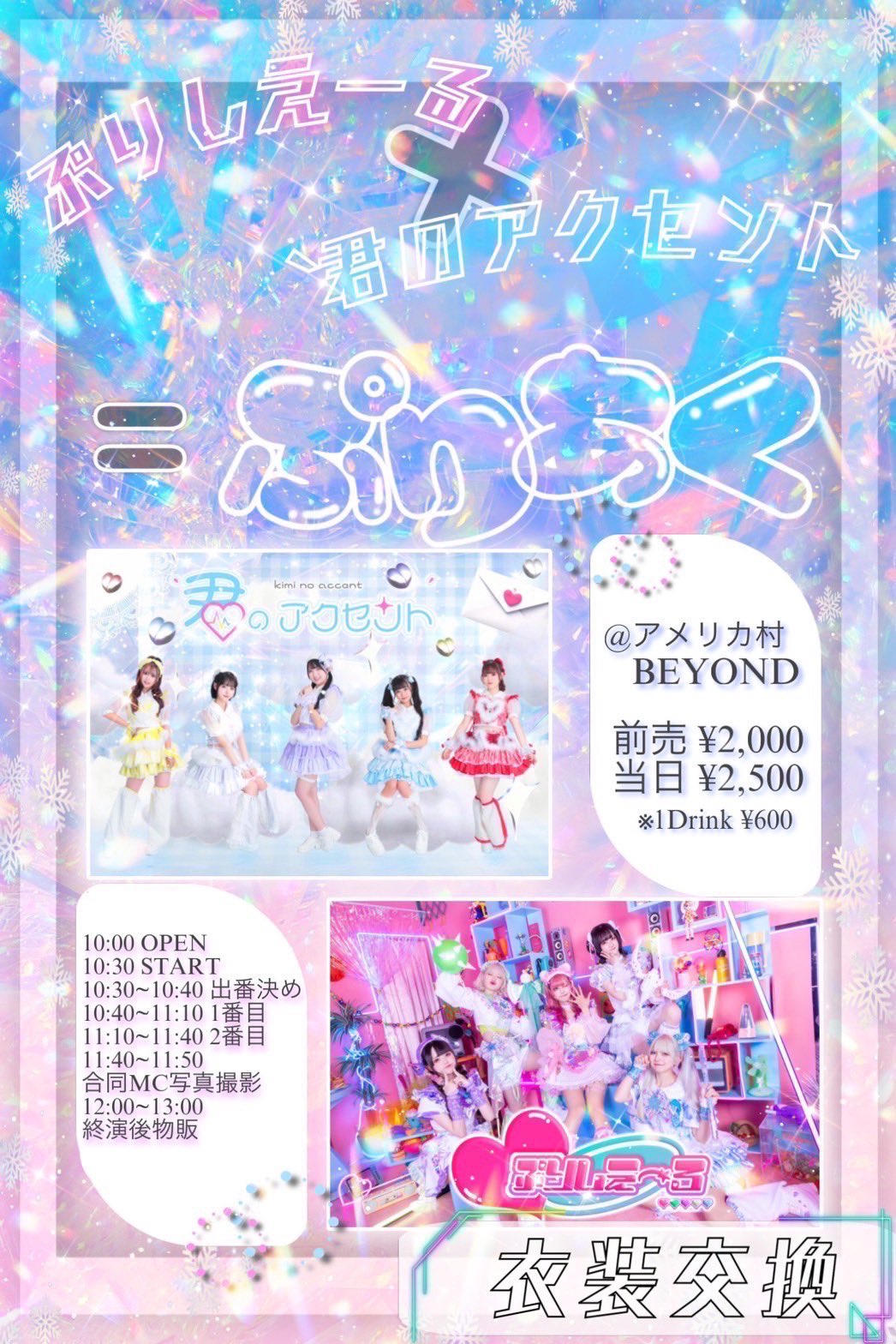 アメリカ村 BEYOND スケジュール 2024.1.28(Sun) '君にアクセント'×ぷりしえーる=ぷりアク [ACT] '君のアクセント' / ぷりしえーる [OPEN/START] 10:00/10:30 [料金] ADV/DOOR ¥2,000/¥2,500(別途1Drink代金¥600-必要) Livepocket:https://t.livepocket.jp/e/puriaku (問)合同会社ZENIKE