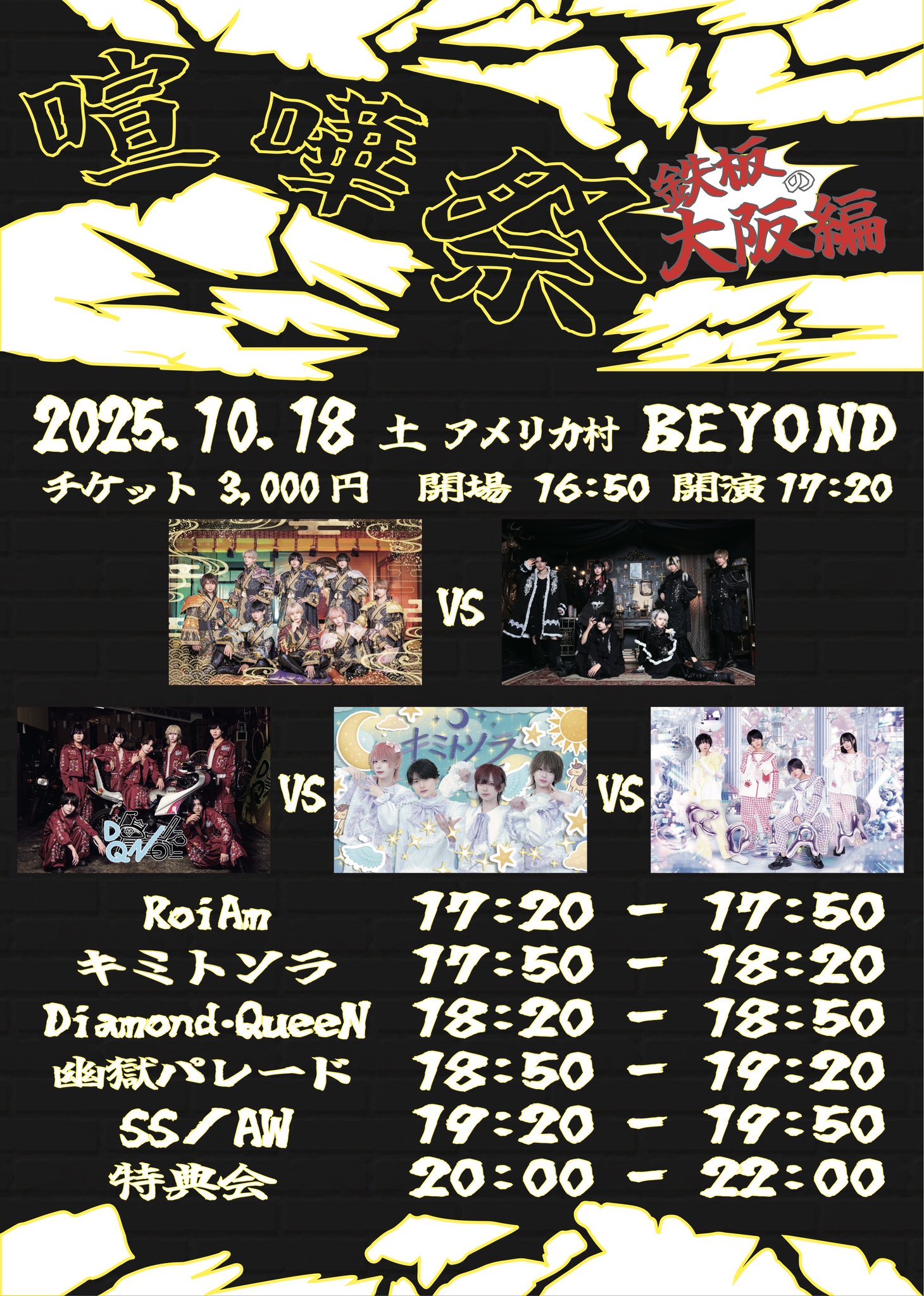 アメリカ村 BEYOND スケジュール 2025.10.18(Sat) 『喧嘩祭-大阪編- 』 [ACT] RoiAm / キミトソラ / Diamond Queen / 幽獄パレード / SS/AW [OPEN/START] 16:50/17:20 [料金] ADV/DOOR ¥3,000/¥--(別途1Drink代金¥700-必要) [チケットURL] http://t.livepocket.jp/e/sgnwt 10/15(水)23:00~ (問)アメリカ村 BEYOND 06-6214-2900