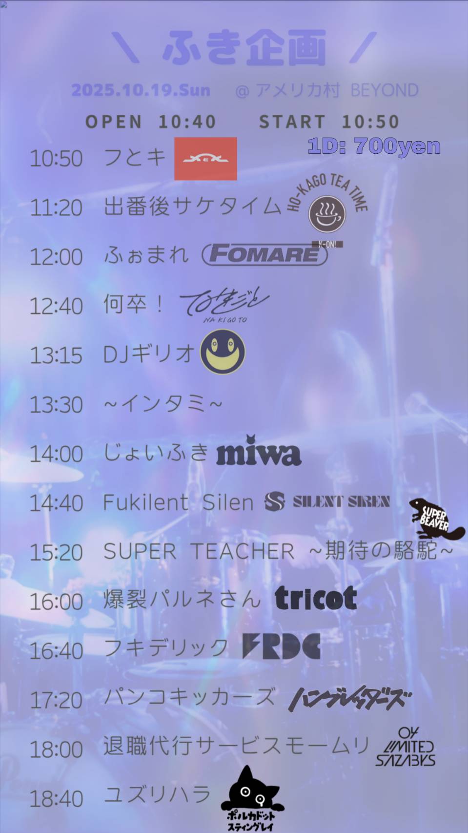 アメリカ村 BEYOND スケジュール 2025.10.19(Sun) ふき企画 [ACT] フとキ / 出番後サケタイム / ふぉまれ / 何卒!/ 荻山DJ / じょいふき / Fukilent Silen / SUPER TEACHER 期待の駱駝 / 爆裂パルネさん / フキデリック / パンコキッカーズ / 退職代行サービスモームリ / ユズリハラ [OPEN/START] 10:40/10:50 [料金] FREE(別途1Drink代金¥700-必要) (問)アメリカ村 BEYOND 06-6214-2900