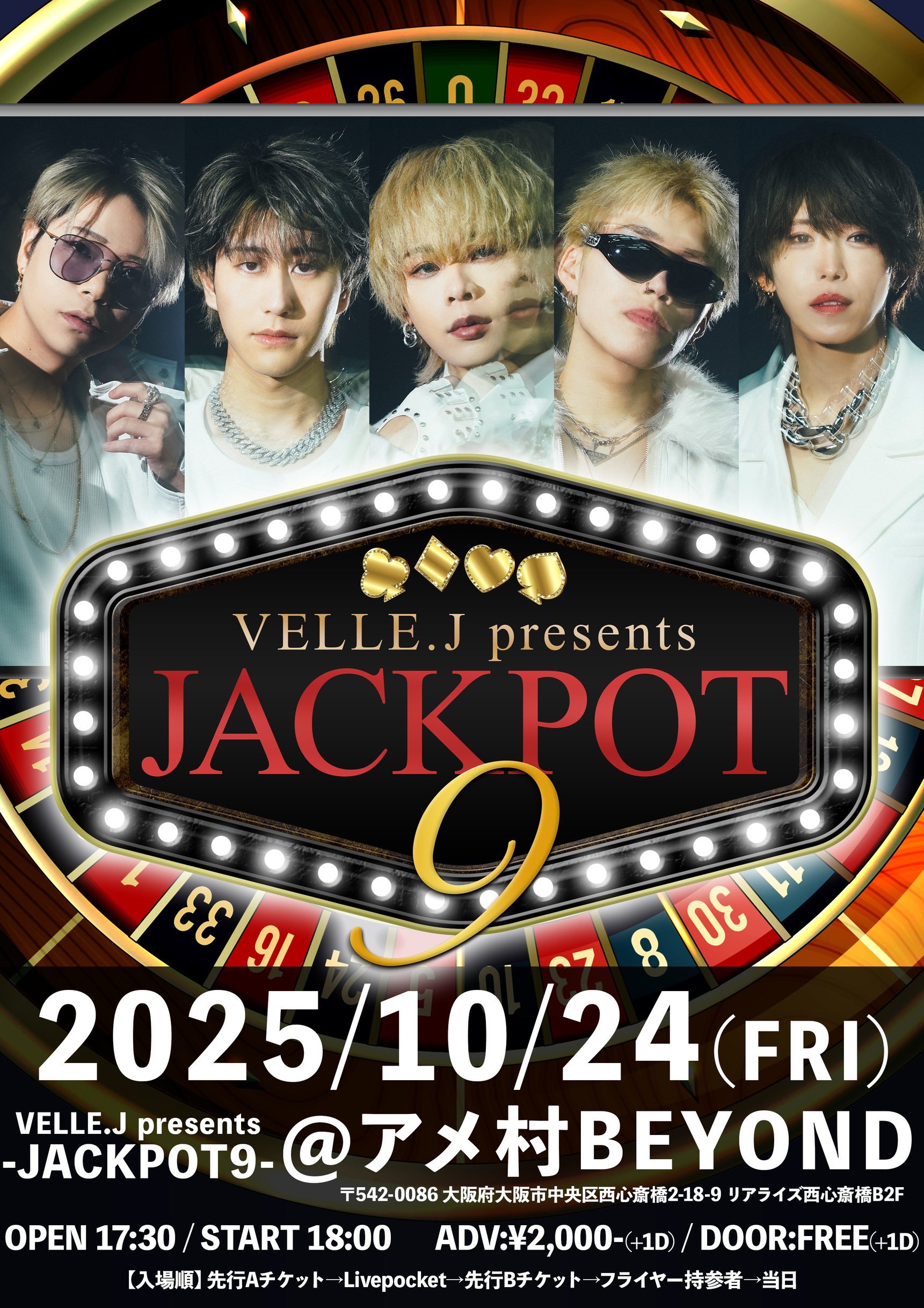 アメリカ村 BEYOND スケジュール 2025.10.24(Fri) VELLE.J presents -JACKPOT9- [ACT] VELLE.J [OPEN/START] 17:30/18:00 [料金] LivePocket ¥2,000- フライヤー持参者 ¥0- 当日券 ¥0(各種、別途1Drink代金¥700-必要) 【入場順】 先行Aチケット→LivePocket→先行Bチケット→フライヤー持参者→当日券 ※先行Aチケット・先行Bチケットは9/22(月)JACKPOT当日のみの販売につき、販売は終了しております。 (問)株式会社オフィスタカタニ