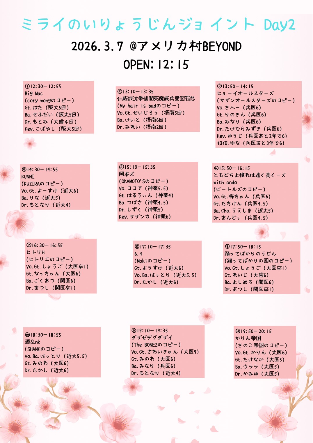 アメリカ村 BEYOND スケジュール 2026.3.07(Sat) ミライのいりょうじんジョイント Day2 [ACT] Big Mac / ともどちよ憧れは遠く高くーズ with ando / 仁威俄汰拳情閲死魔威兵愛図罰怒 / ヒョーイオールスターズ / ヒトリH / 踊ってばかりのうどん / KUNNI / 岡本ズ / 6.4 / 酒乱nk / ダザゼデグダザイ / かりん帝国 [OPEN/START] 12:15/12:30 [料金] 無料(別途1drink代¥700必要) (問)アメリカ村 BEYOND 06-6214-2900