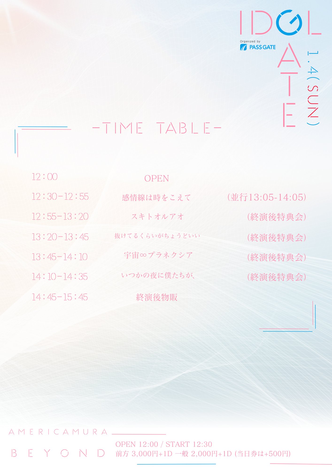 - 前方¥3,000/一般¥2,000(各+1D) ※当日券は各+¥500(各+1D代)