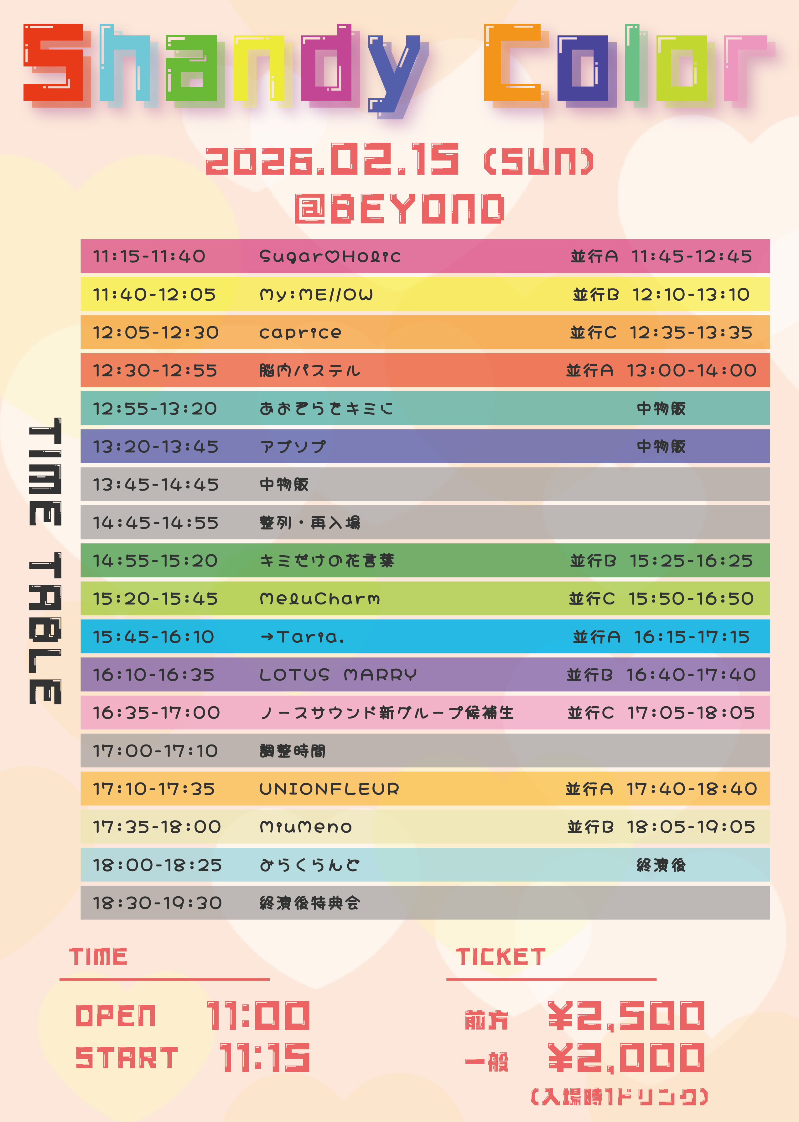 - 前方2,500円 / 通常2,000円 / 当日+1000円(別途1Drink代金¥700-必要)