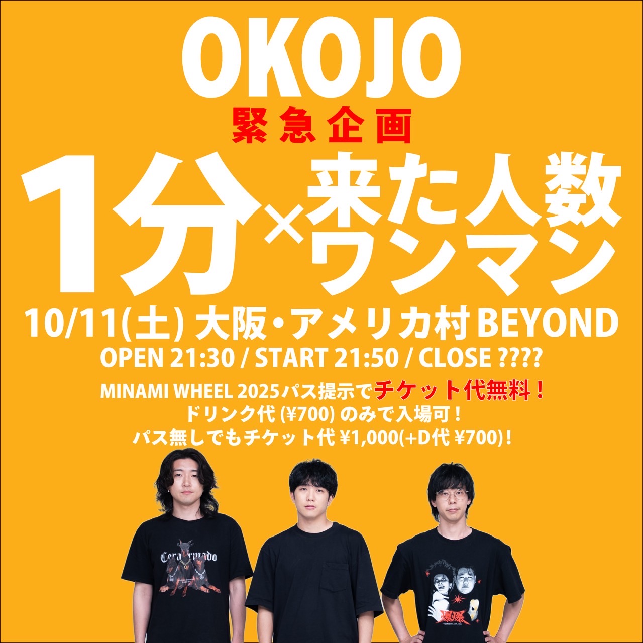 アメリカ村 BEYOND スケジュール 2025.10.11(Sat) OKOJO緊急企画 「1分×来た人数ワンマン」 [ACT] OKOJO [OPEN/START] 21:30/21:50 [料金] DOOR ¥1,000-(別途1Drink代金¥700-必要) ※ミナミホイールー2025パス提示でドリンク代のみで入場可! MINAMI WHEEL 2025パス提示でドリンク代(¥700)のみで入場可! パス無しでもチケット代¥1,000(+D代¥700)! 演奏スタート時に入場された方の数×1分でライブを行います。 ■注意事項■ 事前予約不可 10/11(土)当日【19:30~20:30】に BEYOND前(階段上1階)で整理券配布! ※時間内でも無くなり次第終了。 ※整理券無しでも会場キャパ以内であれば入場可。 ※途中退出はご自由に! (問)アメリカ村 BEYOND 06-6214-2900