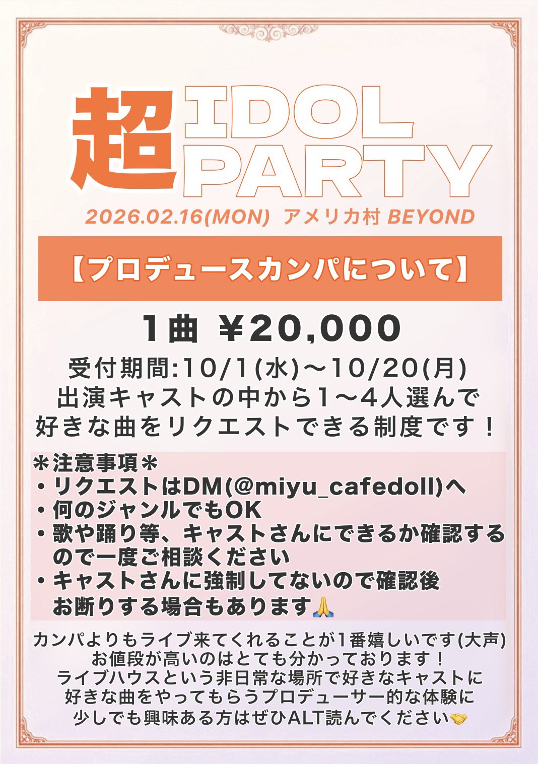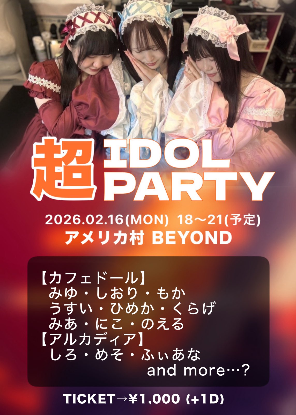 アメリカ村 BEYOND スケジュール 2026.2.16(Mon) 超IDOL PARTY [ACT] 【カフェドール】みゆ / しおり / もか / うすい / ひめか / 海月 / みあ / にこ / のえる【アルカディア】しろ / めそ / ふぃあな [OPEN/START] TBA [料金] TICKET ¥1,000(別途1Drink代金¥700-必要) (問)アメリカ村 BEYOND 06-6214-2900