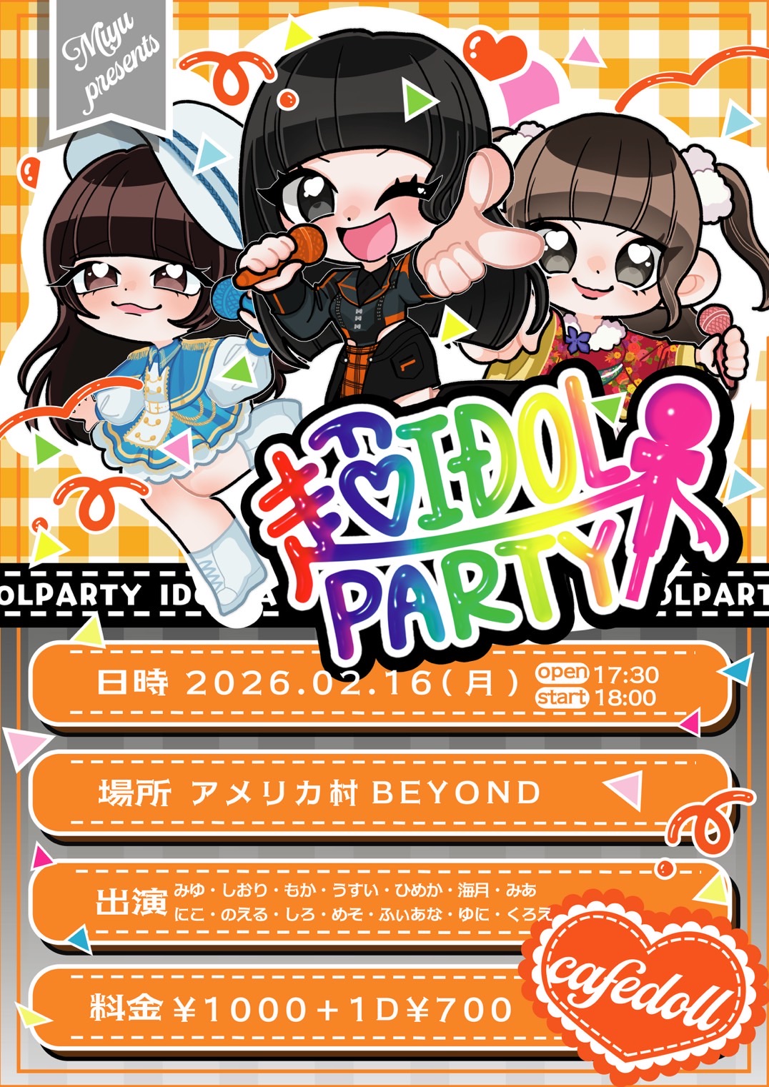 アメリカ村 BEYOND スケジュール 2026.2.16(Mon) 超IDOL PARTY [ACT] みゆ / しおり / もか / うすい / ひめか / 海月 / みあ / にこ / のえる / しろ / めそ / ふぃあな / ゆに / くろえ [OPEN/START] 17:30/18:00 [料金] TICKET ¥1,000(別途1Drink代金¥700-必要) (問)アメリカ村 BEYOND 06-6214-2900