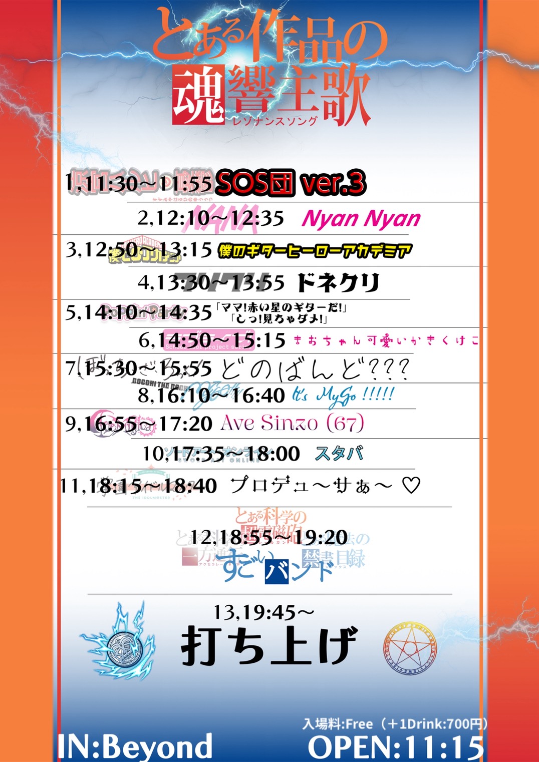 アメリカ村 BEYOND スケジュール 2026.1.04(Sun) とある作品の魂響主歌 [ACT] SOS団ver.3 / どのバンド??? / NyanNyan / 僕のギターヒーローアカデミア / ドネクリ /「ママ!赤い星のギターだ!」「しっ!見ちゃダメ!」/ まおちゃん可愛いかきくけこ / It's MyGo!!!!! / Ave Sinzo(67)/ スタバ / プロデュ〜サぁ〜♥ / すごいバンド [OPEN/START] 11:15/11:30 [料金] 無料(別途1drink代¥700必要) (問)アメリカ村 BEYOND 06-6214-2900
