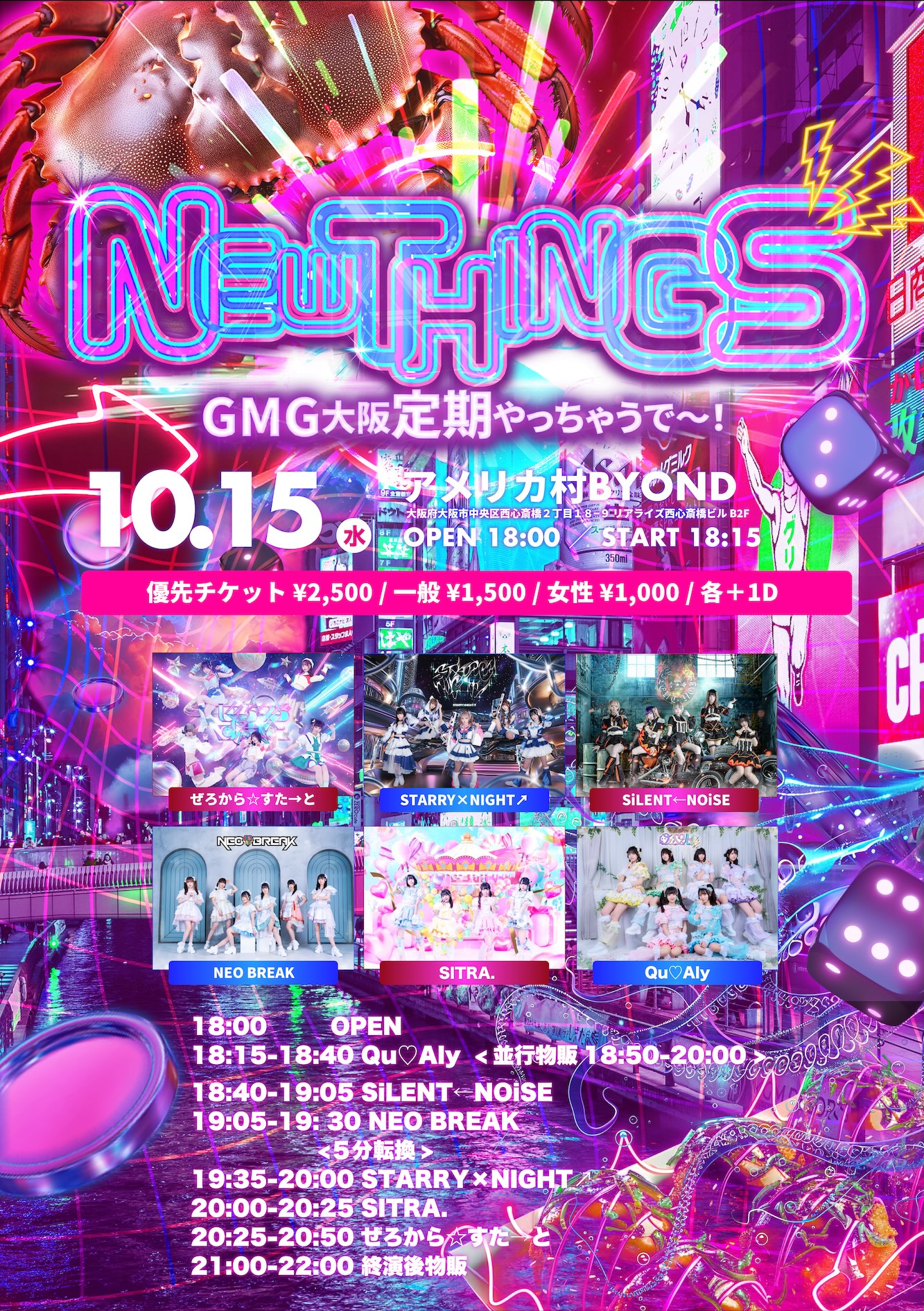 アメリカ村 BEYOND スケジュール 2025.10.15(Wed) NEW THINGS [ACT] ぜろから☆すた→と / STARRY×NIGHT↗ / SiLENT←NOiSE / SITRA. / NEO BREAK / Qu♡Aly [OPEN/START] 18:00/18:15 [料金] 優先チケット ¥2,500 / 一般¥1,500 / 女性¥1,000(別途1Drink代金¥700-必要) https://t.livepocket.jp/e/it8g5 (問)アメリカ村 BEYOND 06-6214-2900
