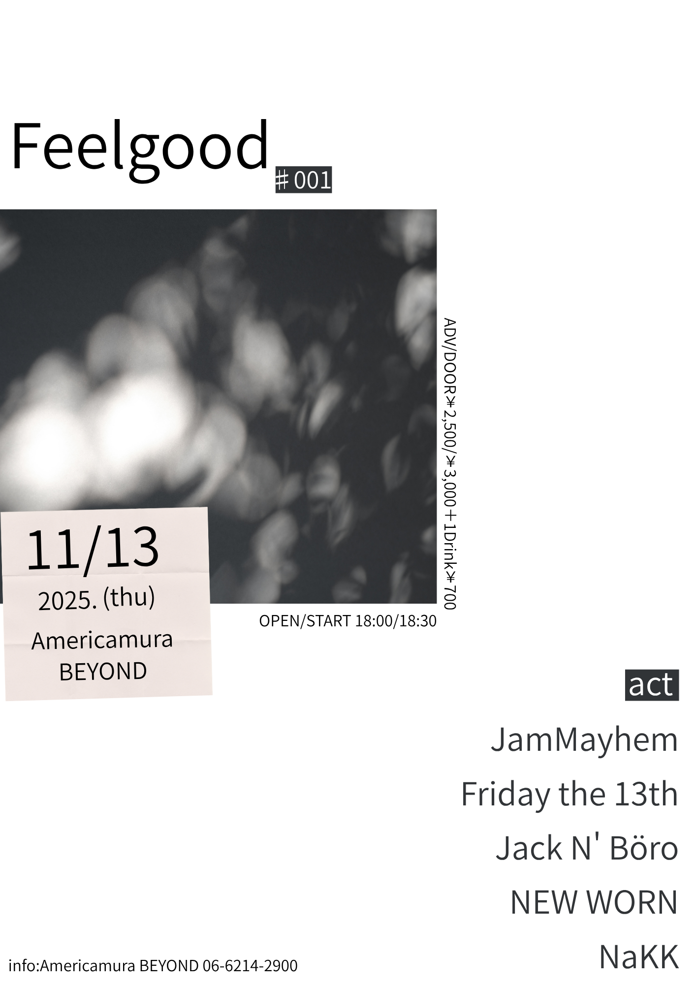 アメリカ村 BEYOND スケジュール 2025.11.13(Thu) Feelgood ♯001 [ACT] JamMayhem / Friday the 13th / Jack N' Böro / NEW WORN / NaKK [OPEN/START] 18:00/18:30 [料金] ADV/DOOR ¥2,500/¥3,000(別途1Drink代金¥700-必要) (問)アメリカ村 BEYOND 06-6214-2900