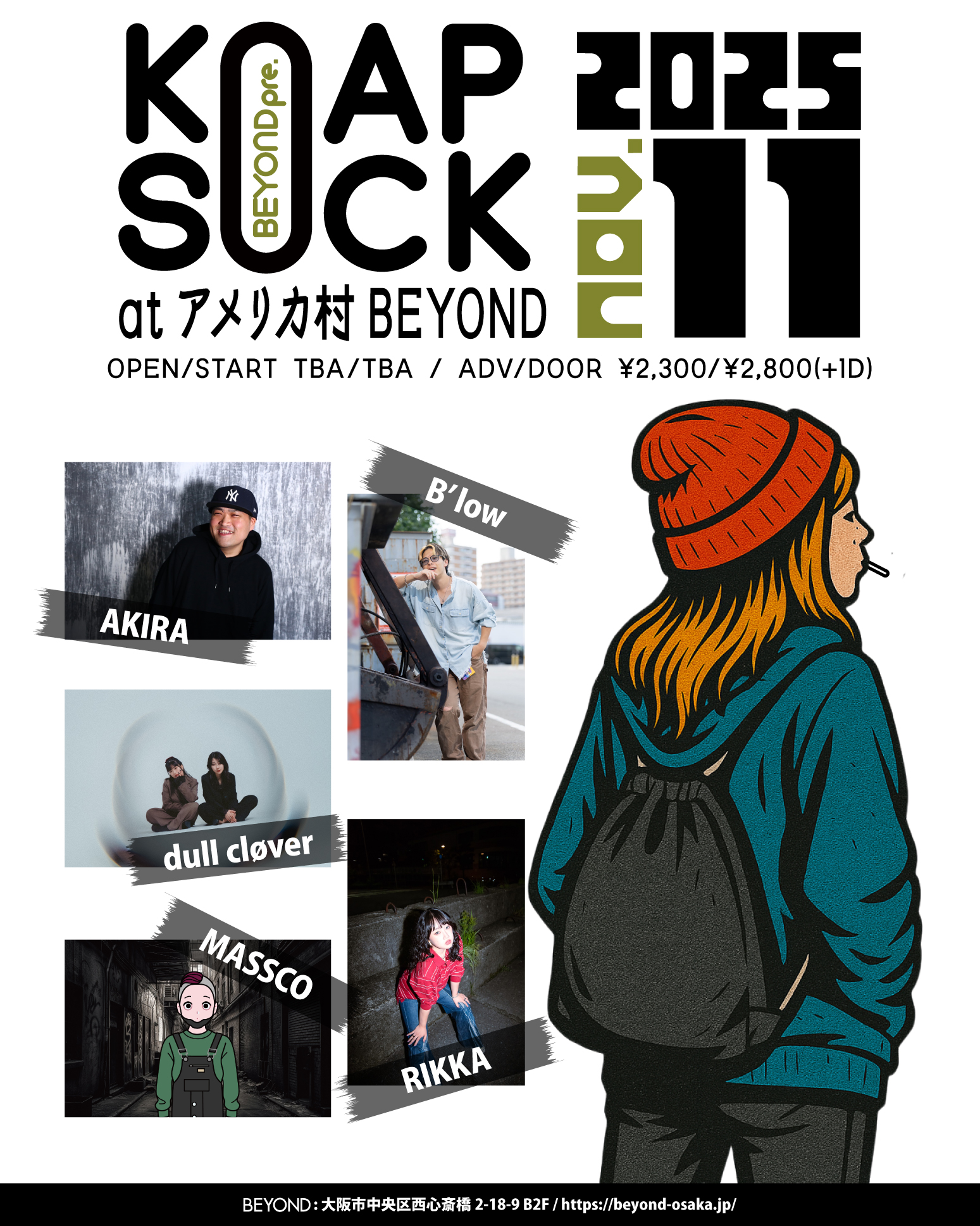 アメリカ村 BEYOND スケジュール 2025.11.11(Tue) BEYOND presents. KNAPSUCK [ACT] MASSCO / AKIRA / RIKKA / B'low / dull cløver [OPEN/START] 19:00/19:30 [料金] ADV/DOOR ¥2,300/¥2,800(別途1Drink代金¥700-必要) (問)アメリカ村 BEYOND 06-6214-2900