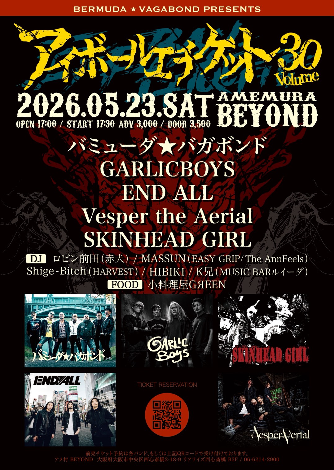 - バミューダ★バガボンド / GARLICBOYS / END ALL / Vesper the Aerial / SKINHEAD GIRL [DJ] ロビン前田(赤犬) / MASSUN(EASY GRIP/The AnnFeels) / Shige-Bitch(HARVEST) / HIBIKI / K兄(MUSIC BAR ルイーダ) [FOOD] 小料理屋GЯEEN