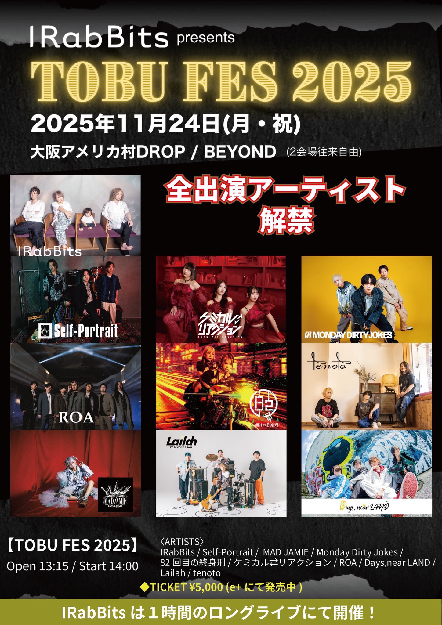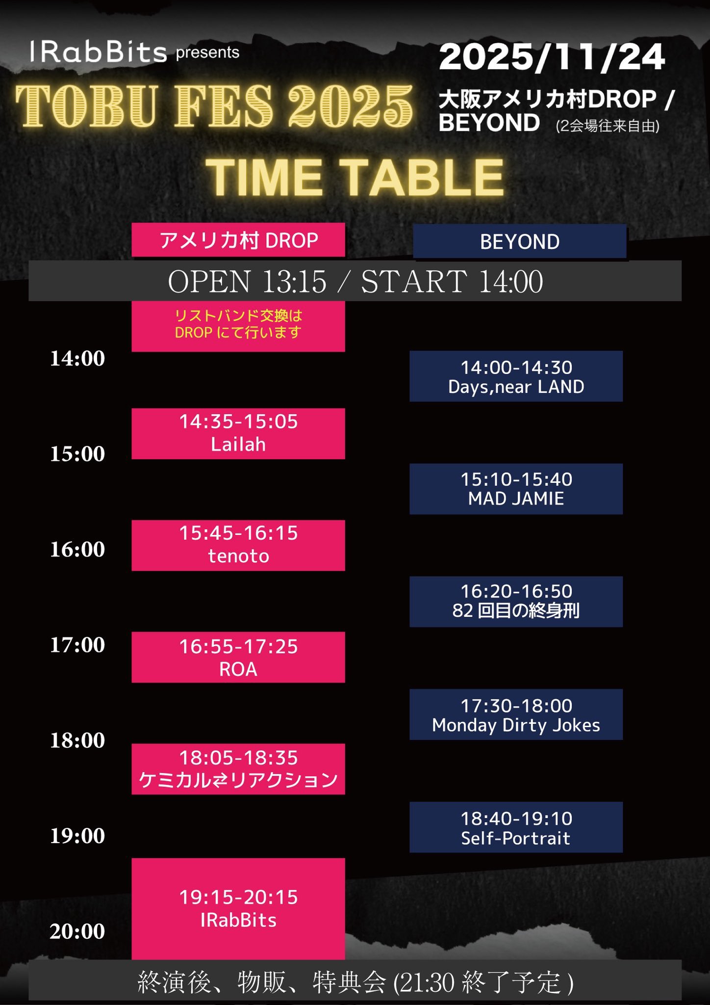 アメリカ村 BEYOND スケジュール 2025.11.24(Mon) TOBU FES 2025 [ACT] IRabBits / Self-Portrait / MAD JAMIE / Monday Dirty Jokes / 82回目の終身刑 / ケミカル⇄リアクション / ROA / Lailah / Days,near LAND / tenoto [OPEN/START] 13:15/14:00 [料金] ADV/DOOR ¥5,000/¥--(別途1Drink代金¥700-必要) (問)アメリカ村 BEYOND 06-6214-2900