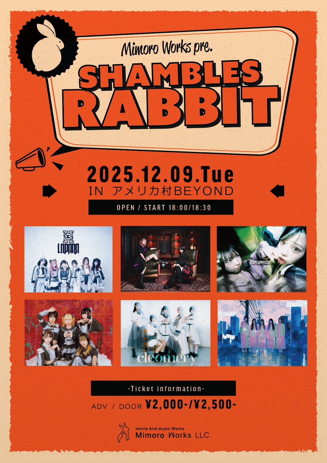 アメリカ村 BEYOND スケジュール 2025.12.09(Tue) Mimoro Works pre 『Shambles Rabbit』 [ACT] LΩPARA / cleomery / 感情線は時をこえて / CØCØRIZE / ELLIC / LØISLOID [OPEN/START] 18:00/18:30 [料金] ADV/DOOR ¥2000/¥2500(別途1Drink代金¥700-必要) (問)アメリカ村 BEYOND 06-6214-2900 【チケット】▼ https://livepocket.jp/e/rabbit_1209 ※2025年11月18日 22:00 発売開始