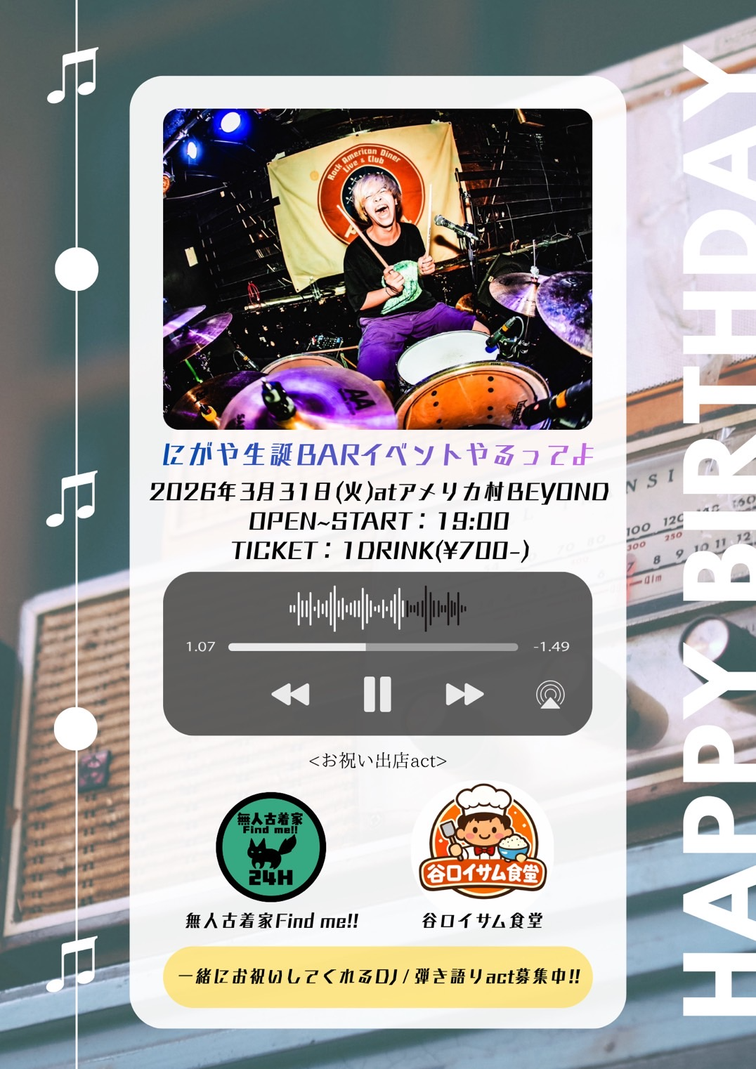 アメリカ村 BEYOND スケジュール 2026.3.31(Tue) にがや生誕BARイベントやるってよ [ACT] にがや / and more! 【お祝い出店act】無人古着屋Find me!! / 谷口イサム食堂 [OPEN/START] 19:00 [料金] FREE(別途1Drink代金¥700-必要) (問)アメリカ村 BEYOND 06-6214-2900