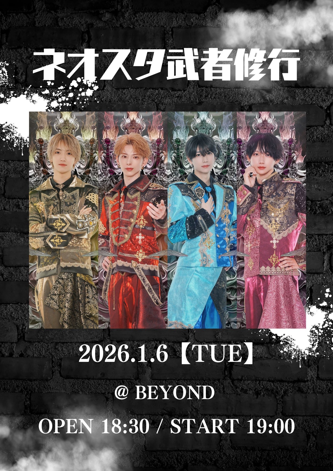 アメリカ村 BEYOND スケジュール 2026.1.06(Tue) ネオスタ武者修行 [ACT] NeoAster [OPEN/START] 18:30/19:00 [料金] DOOR ¥0(別途1Drink代金¥700-必要) 整列▶︎18:00 整番引き▶︎18:15