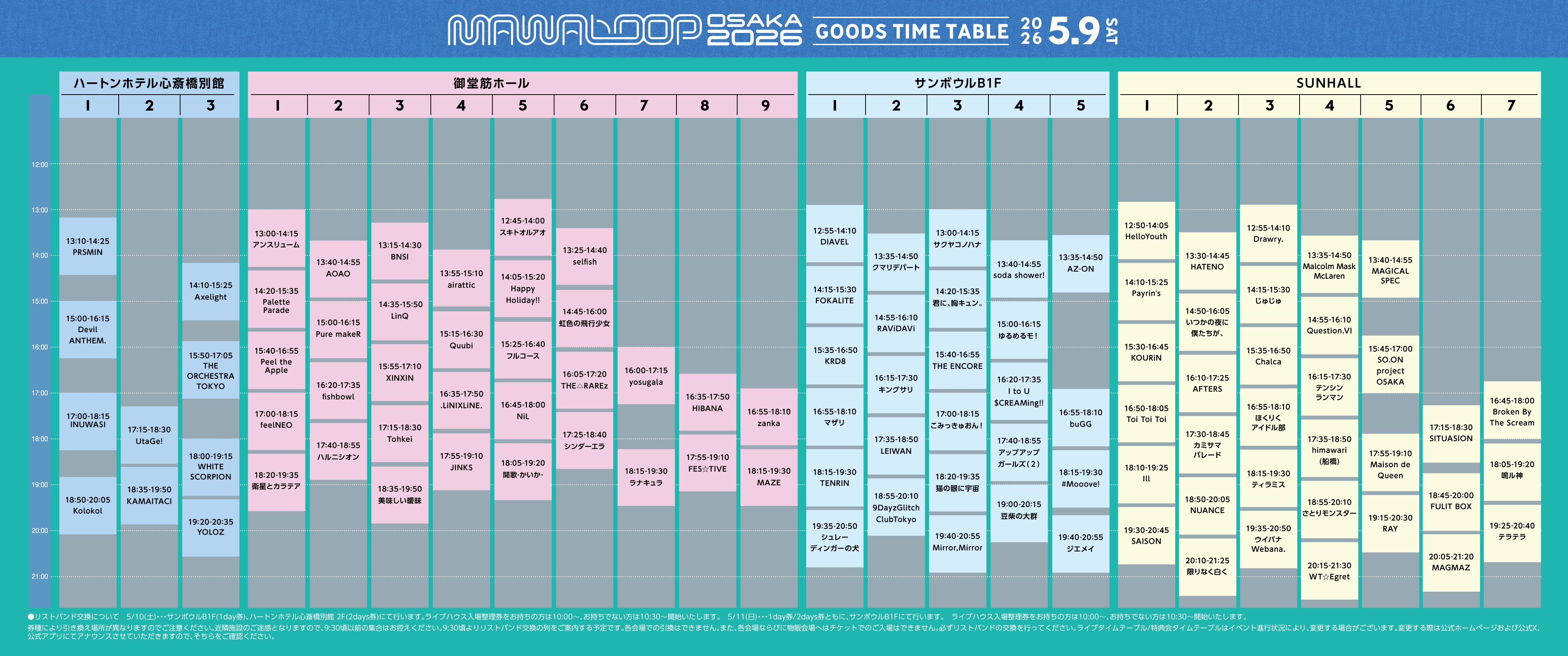 - リストバンド交換 10:00 / 開場 11:30 / 開演 12:00 ※会場により開場/開演時間が異なります。